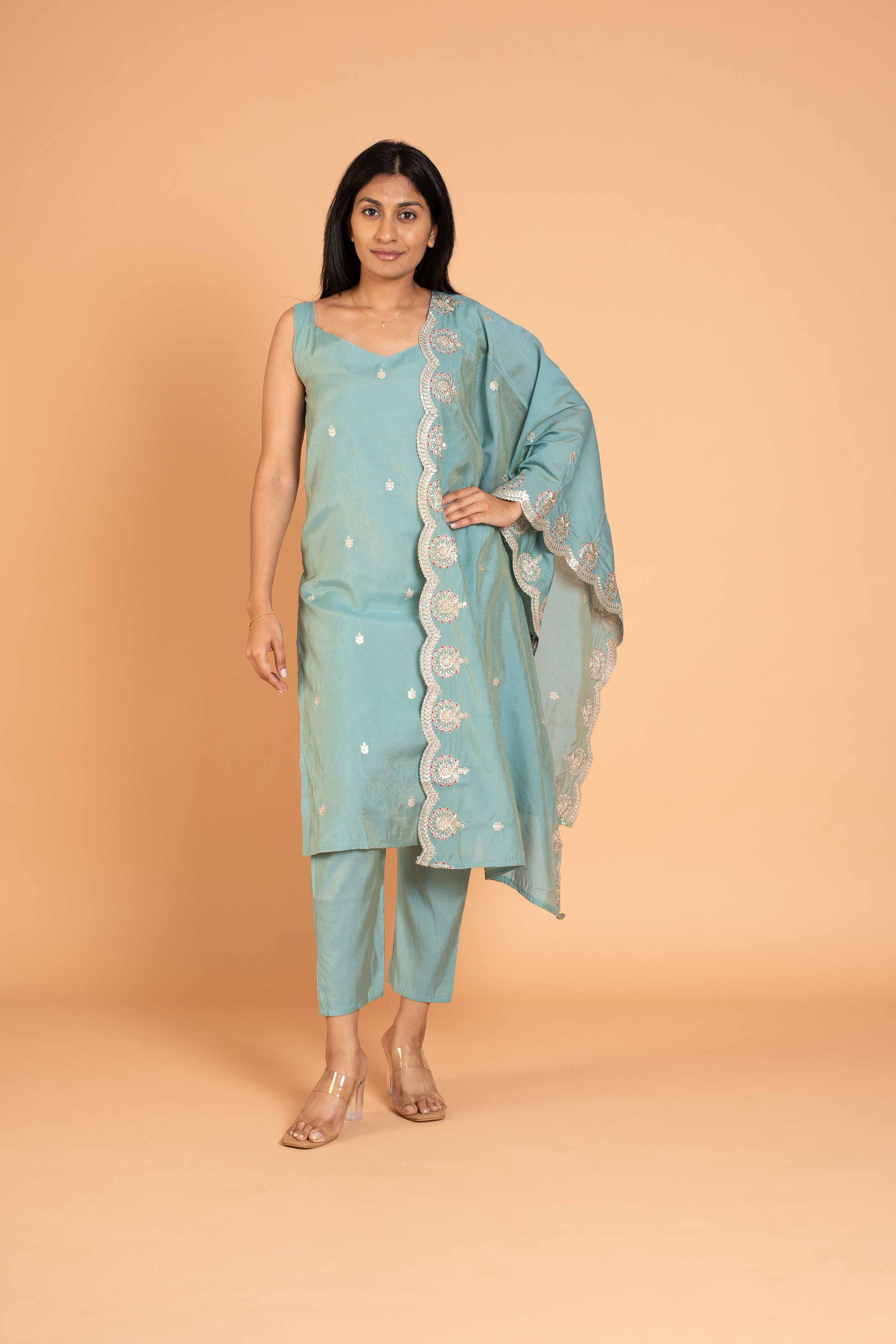 Chanderi Silk Kurti, Bottom and Dupatta Set With Beautiful Machine Embroidery