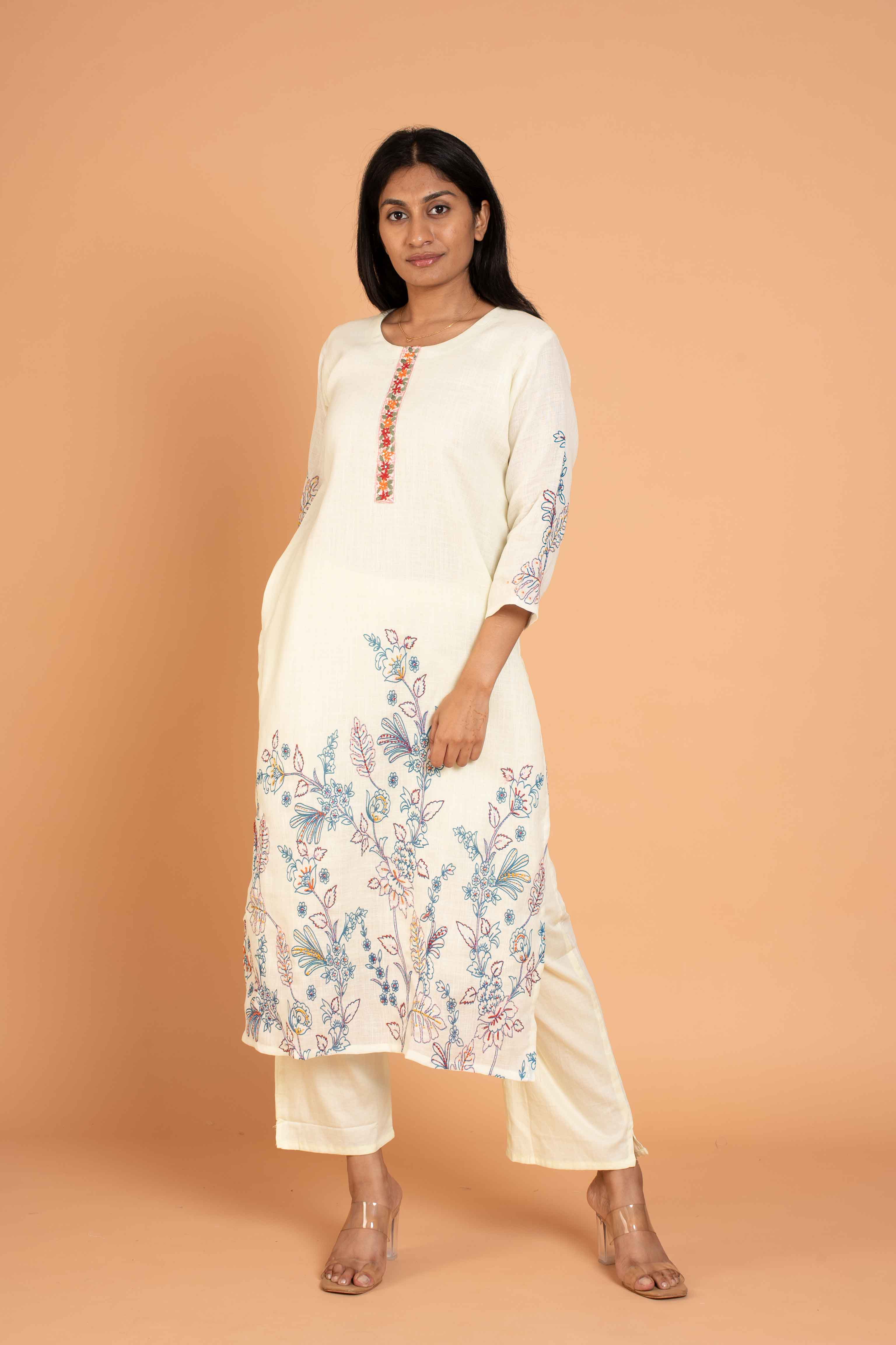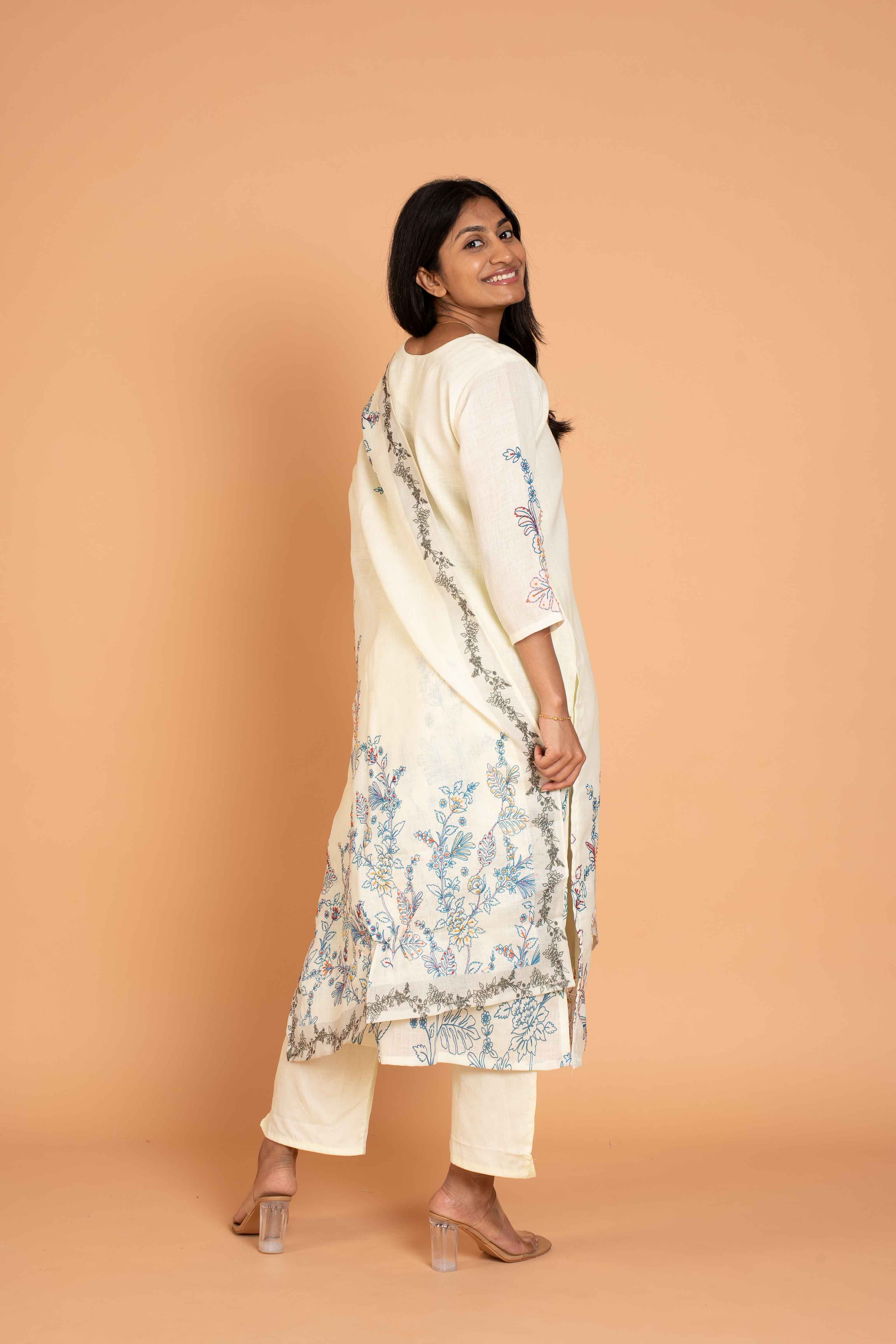 Lenin Cotton Pastel Lemon Yellow Kurti, Bottom And Dupatta Set With Beautiful Hand Embroidery