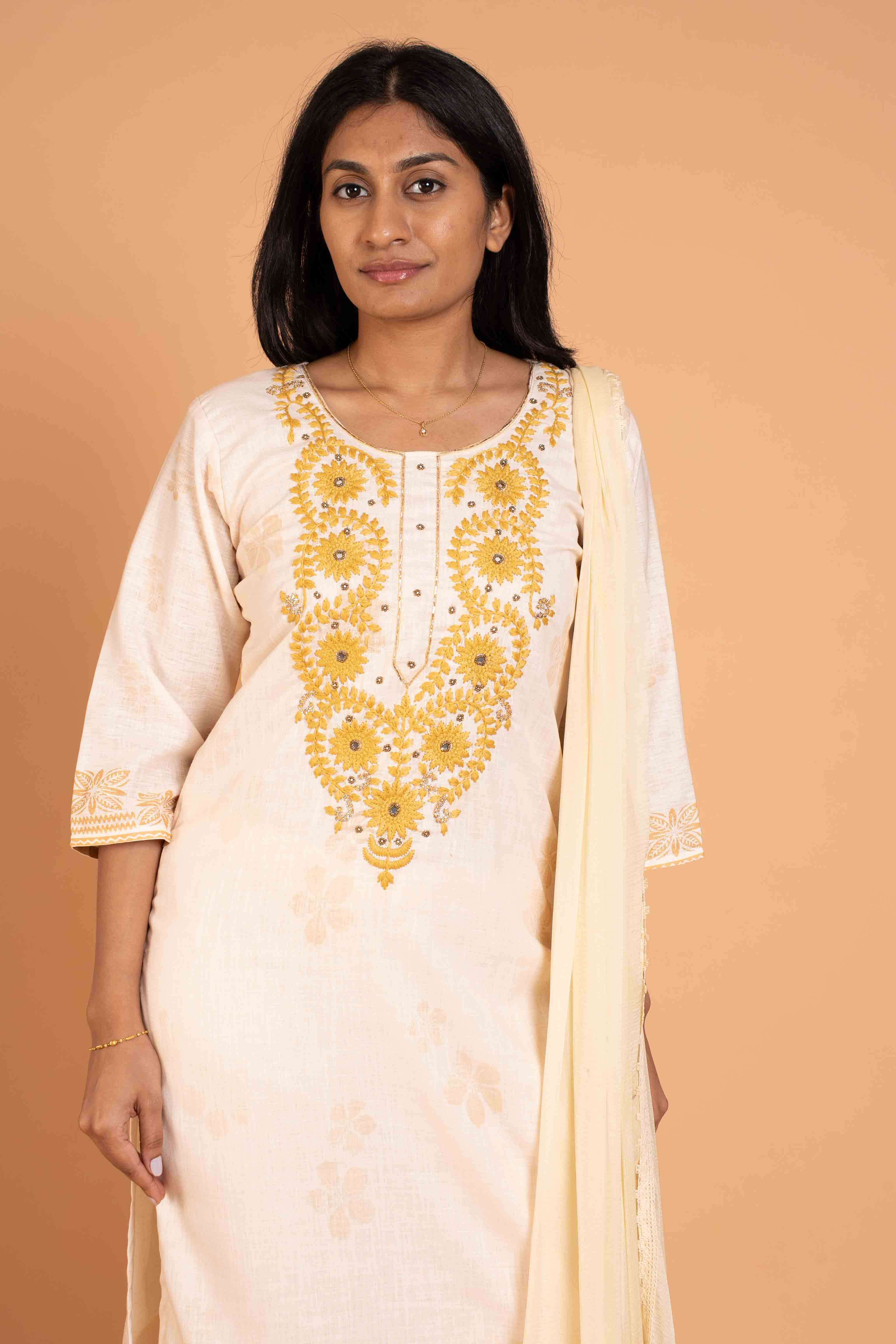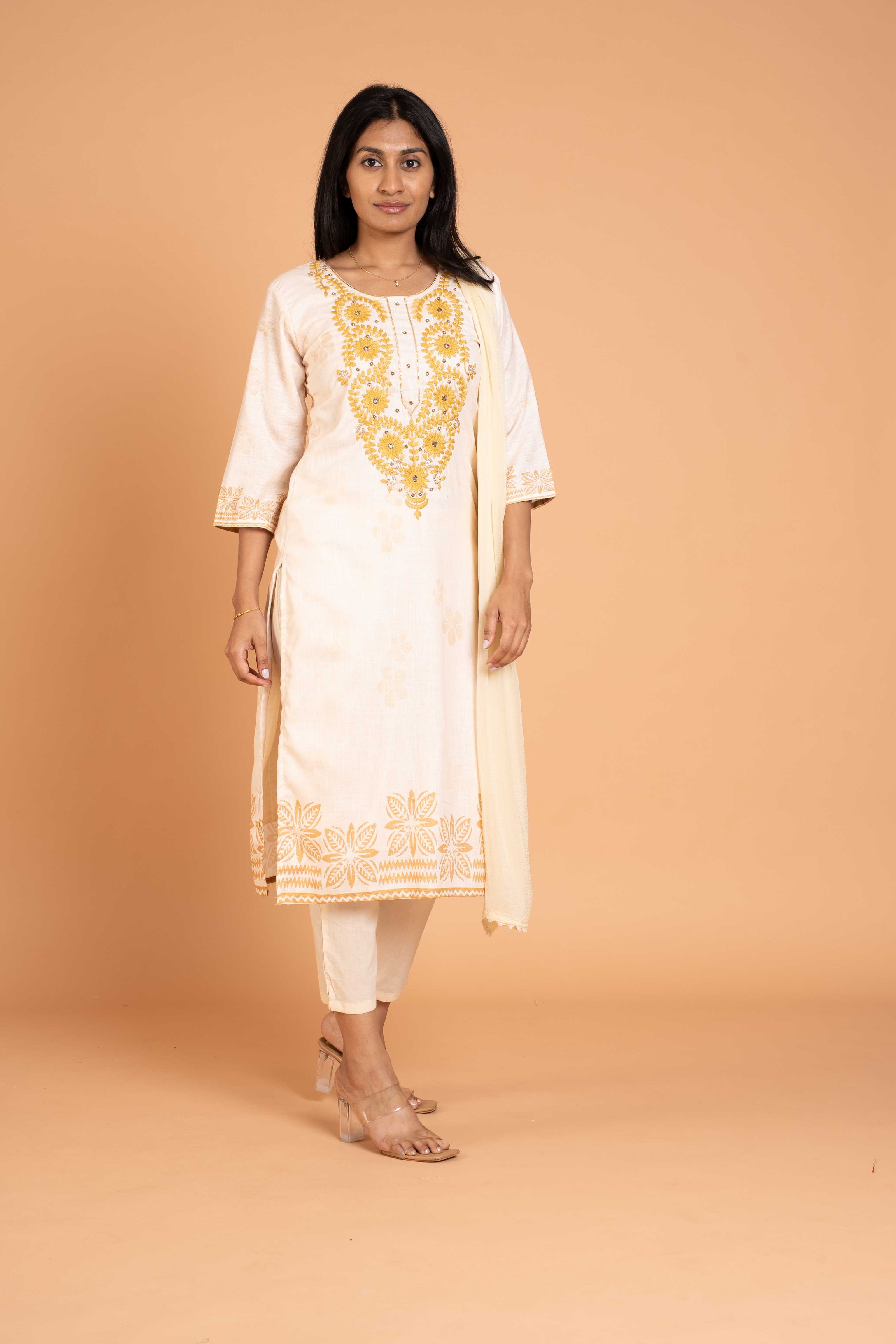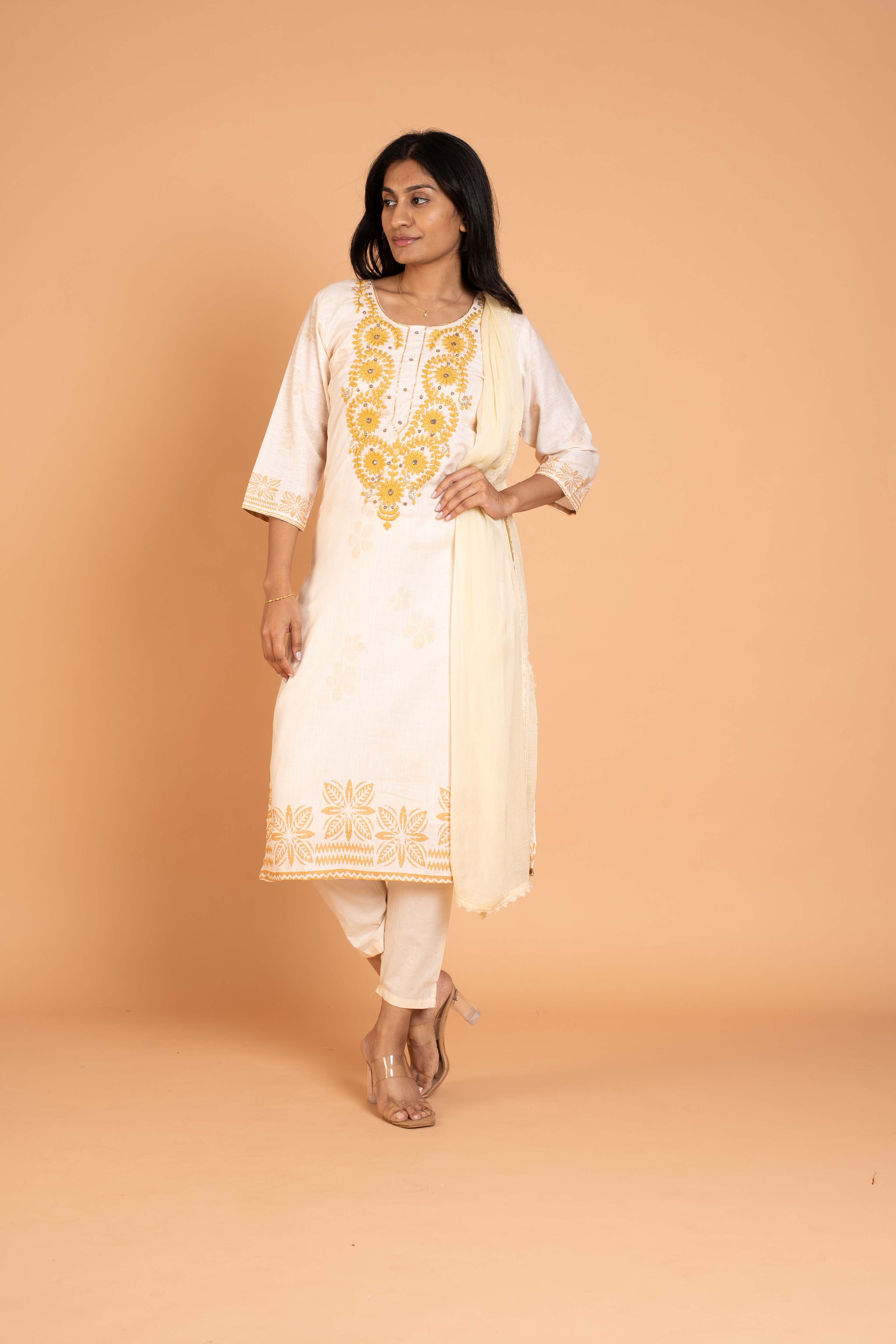 Lenin Cotton Beige Kurti, Bottom And Dupatta Set With Beautiful Mustard Colour Hand Embroidery