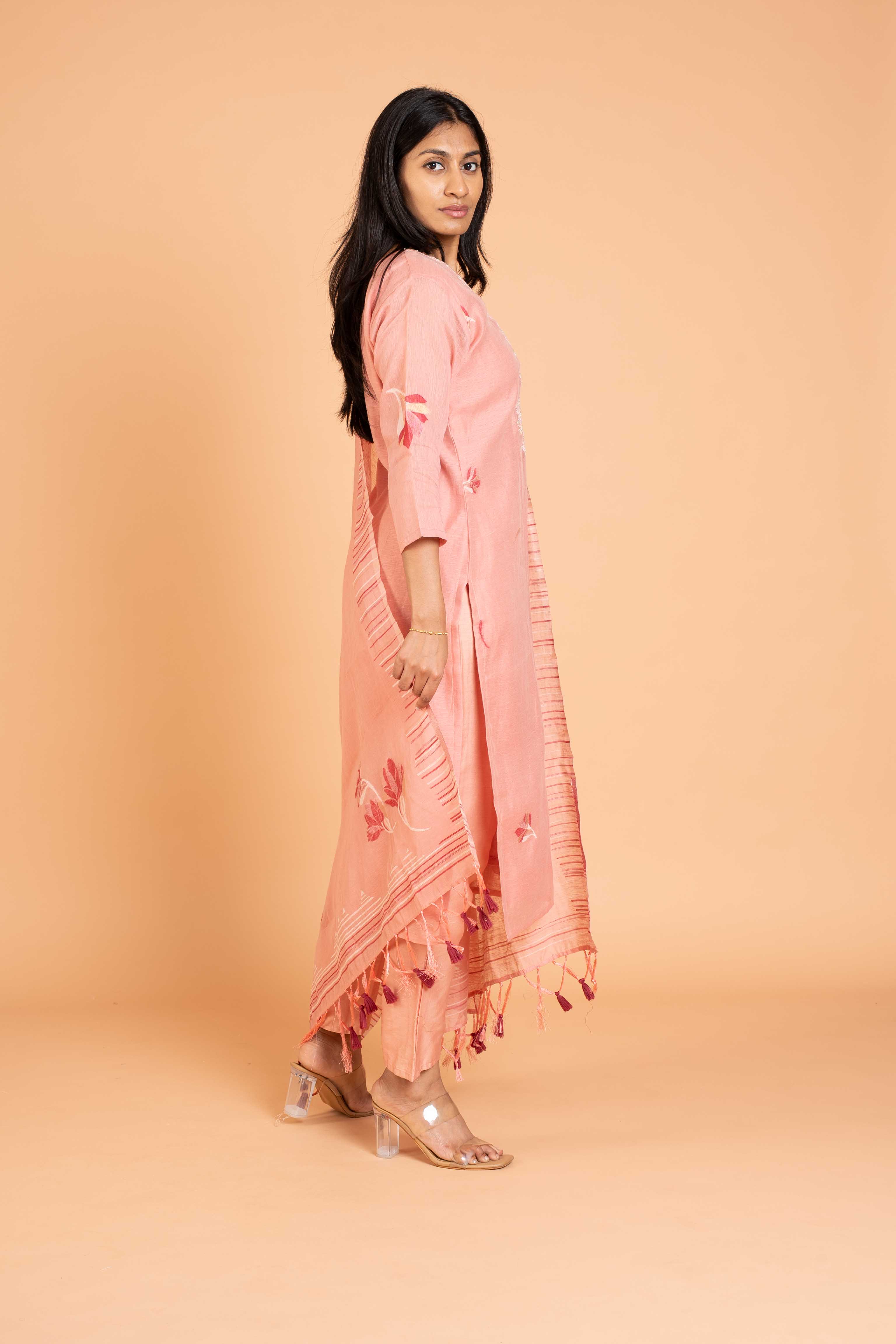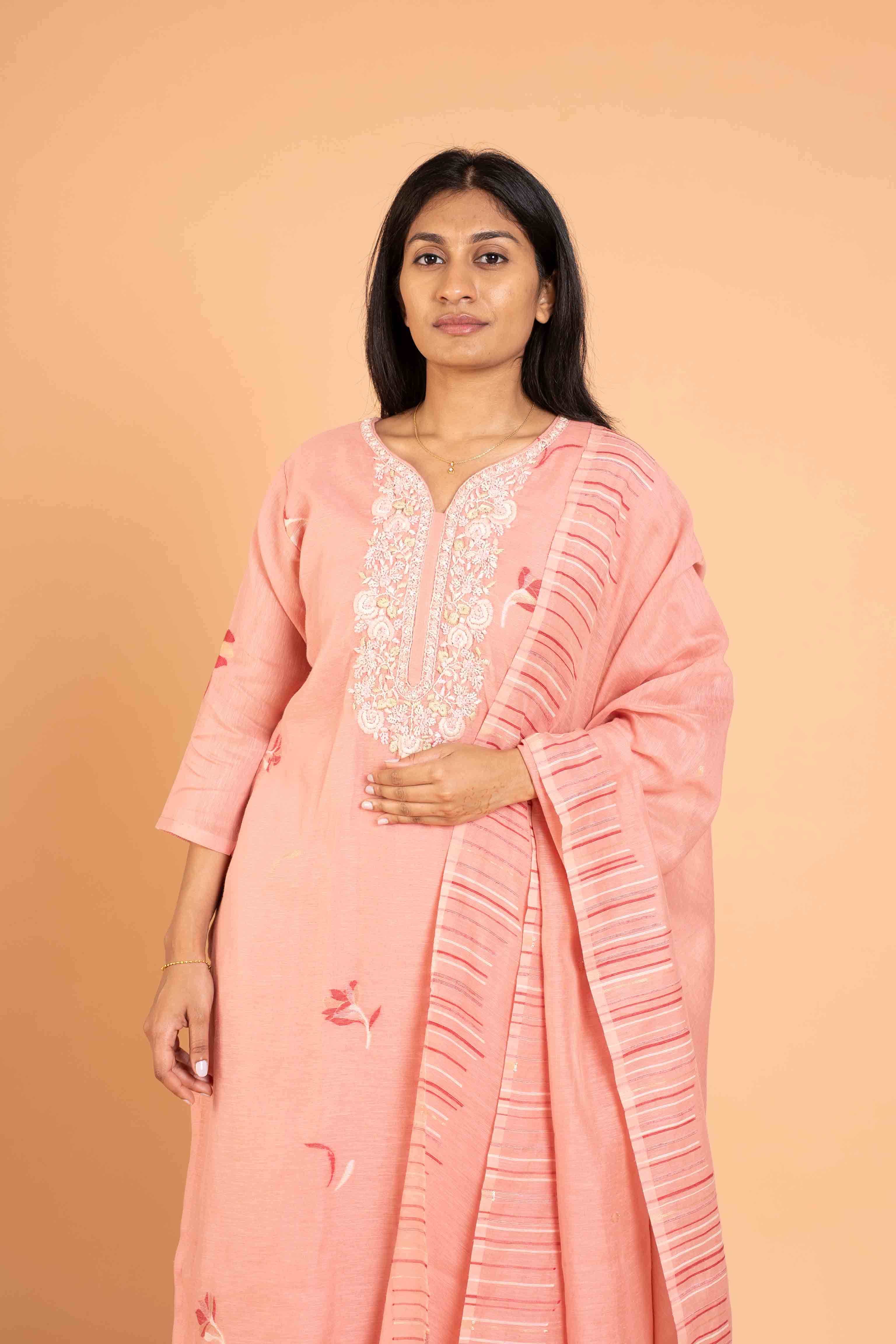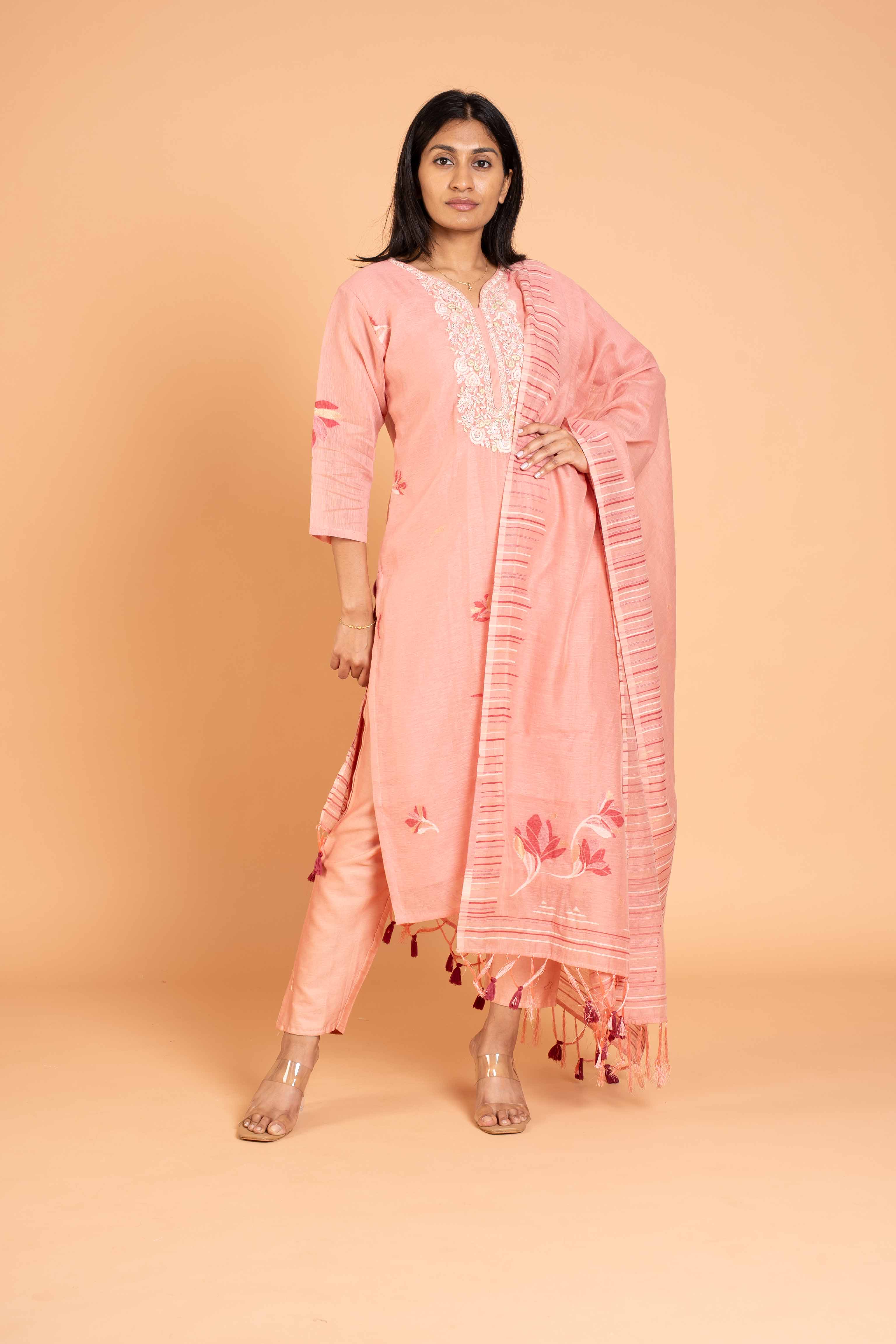 Pure Cotton Pastel Pink Kurti, Bottom and Dupatta Set With Beautiful Hand Embroidery