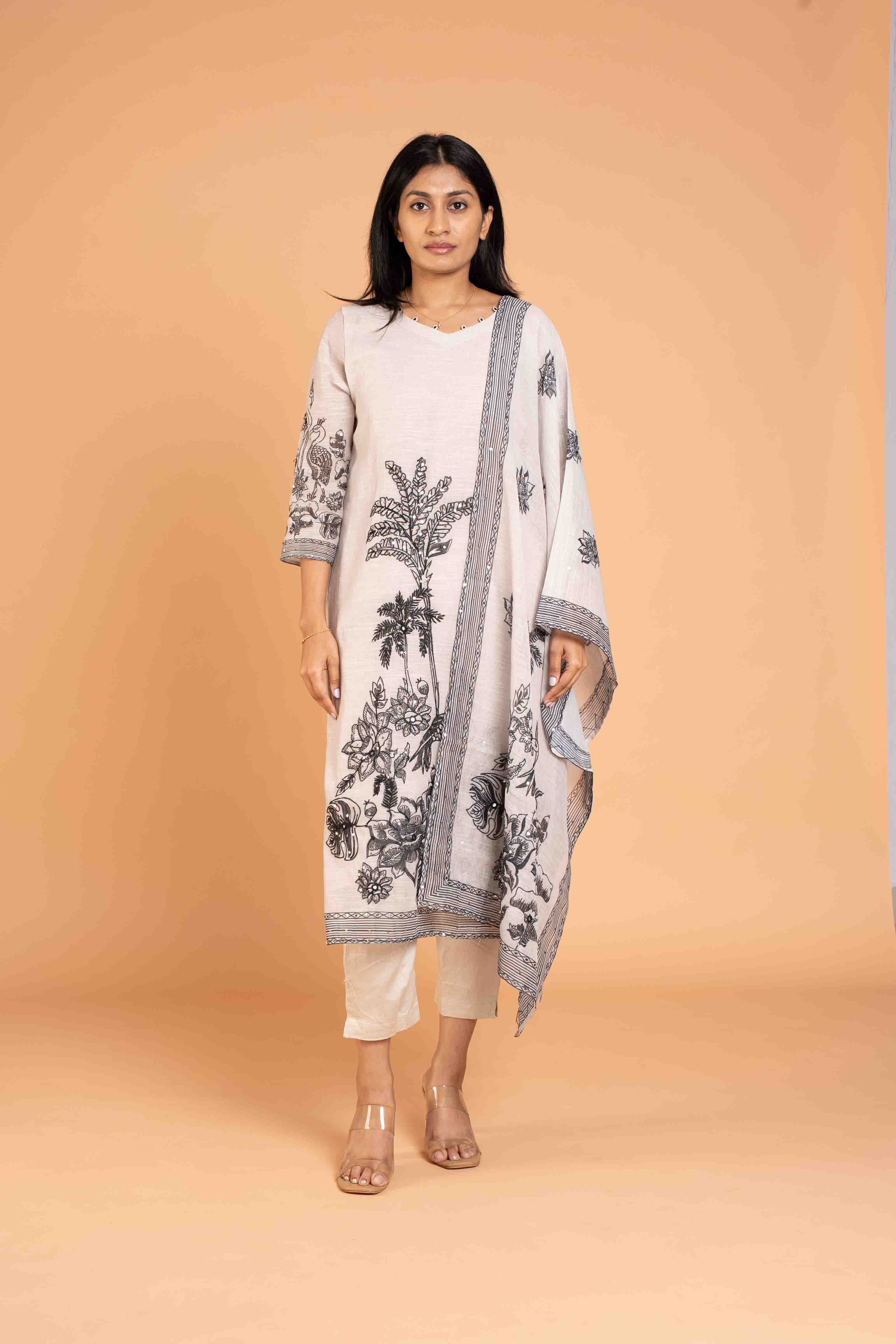 Linen Cotton Black and Off White Kurti, Bottom And Dupatta Set With Beautiful Hand Embroidery