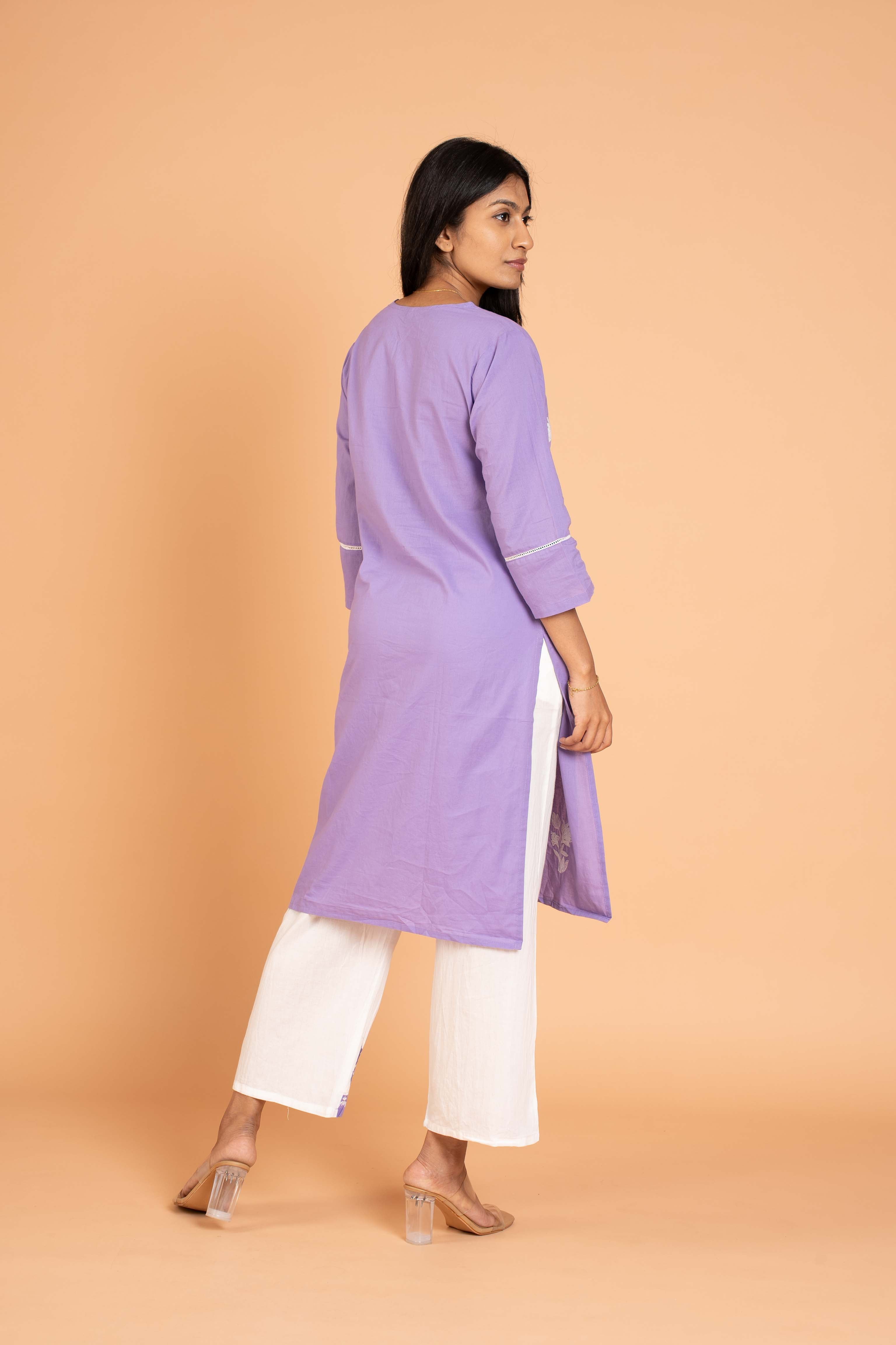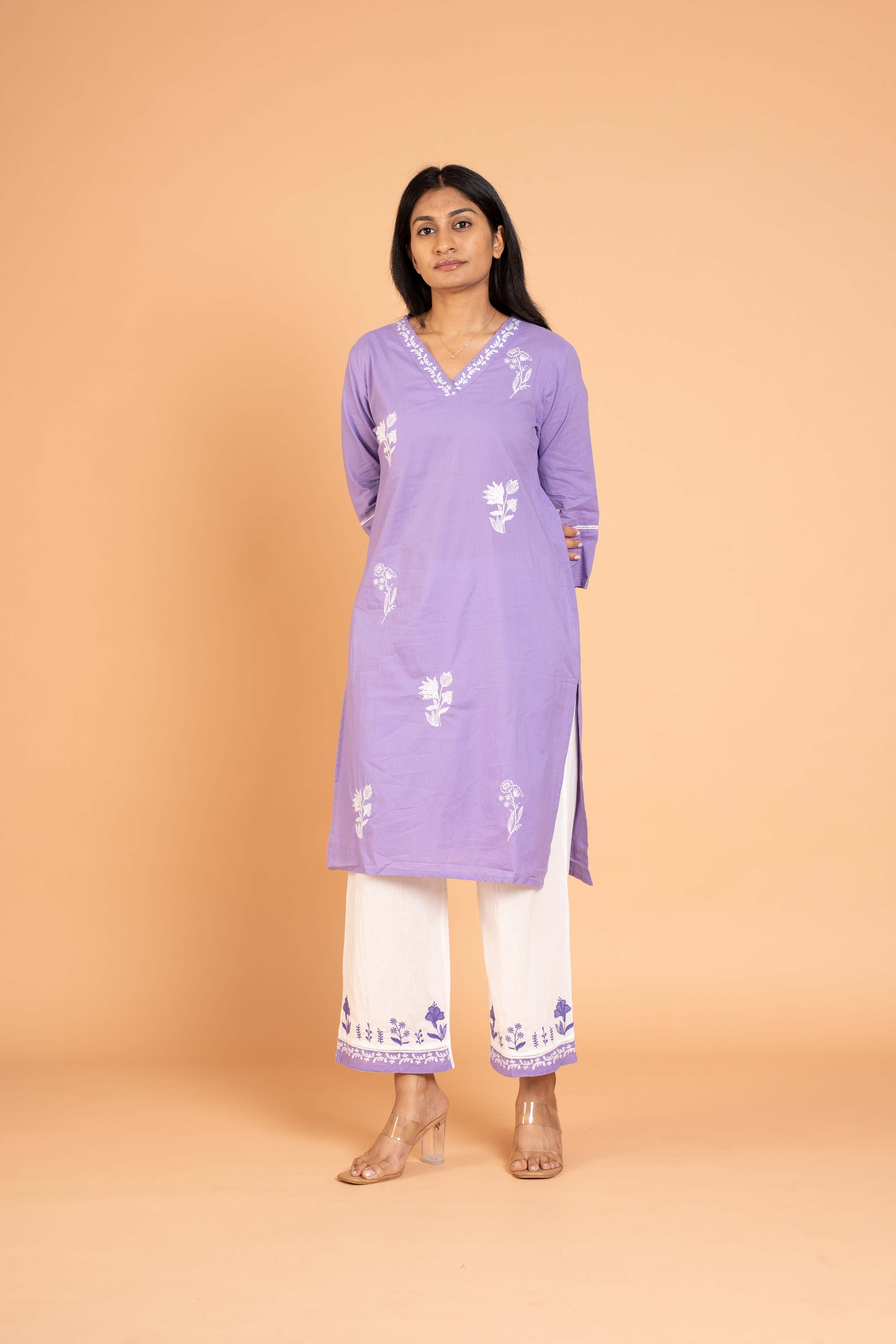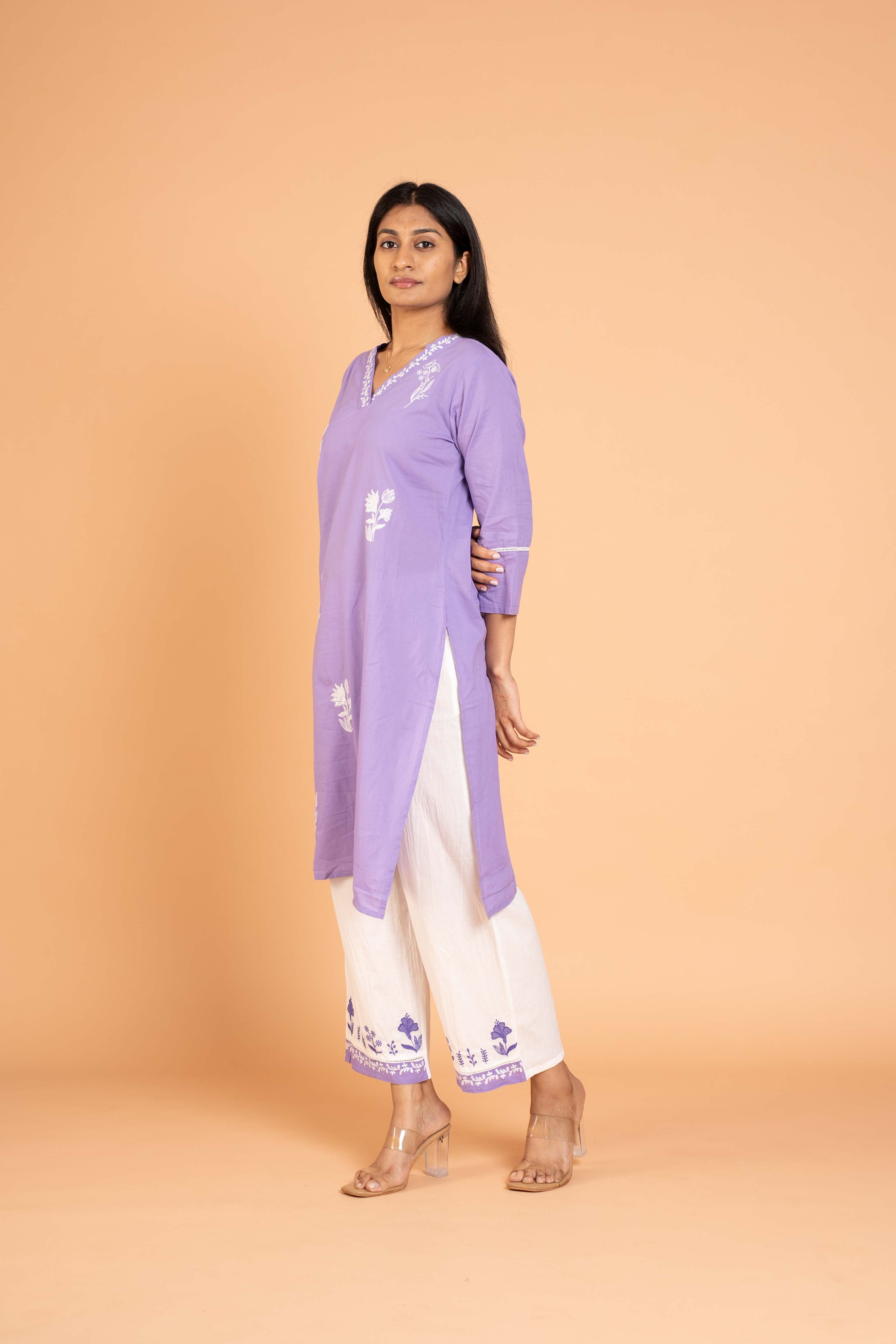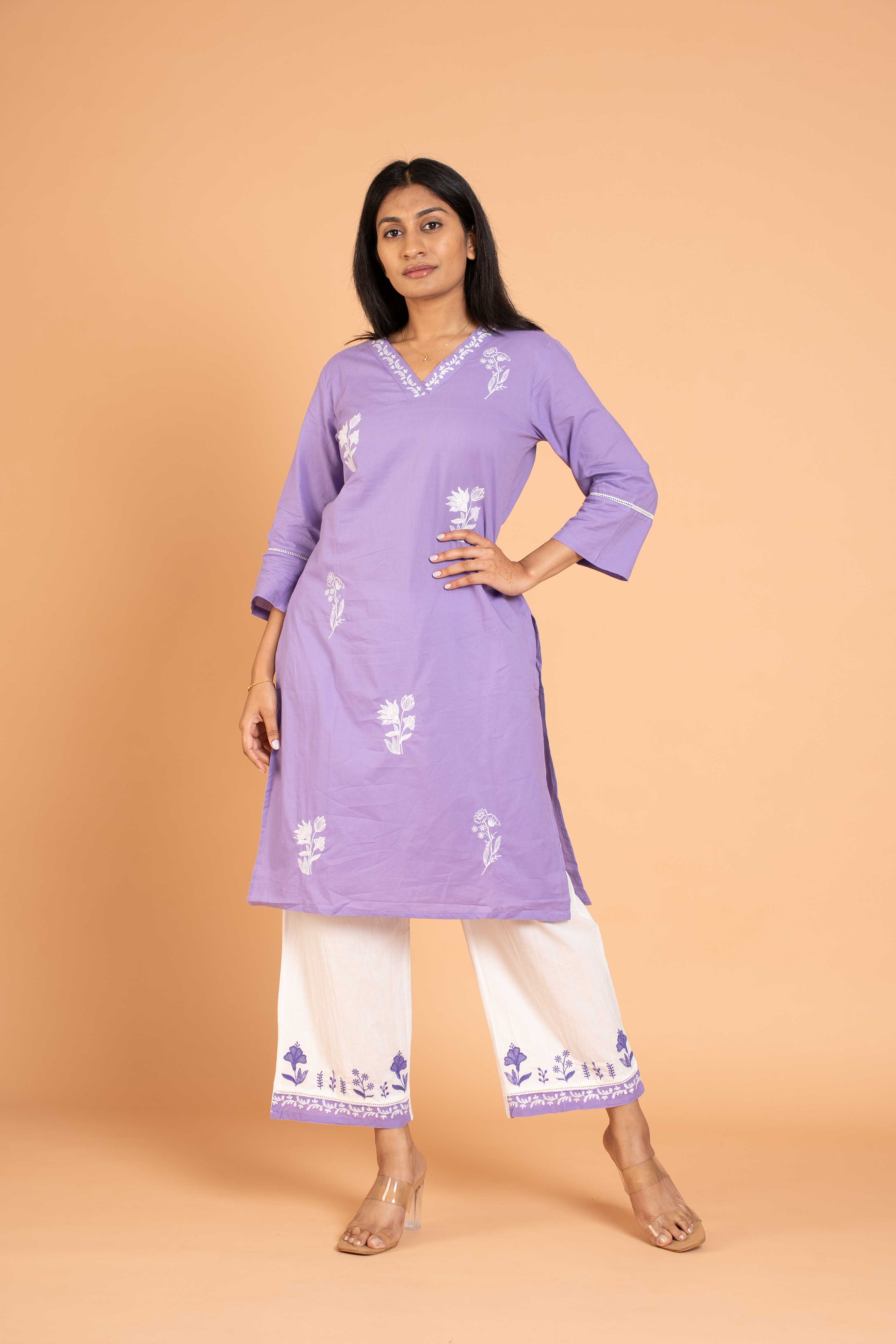 Pure Cotton Beautiful Violet Two Piece Kurta And Bottom Set With Embroidery