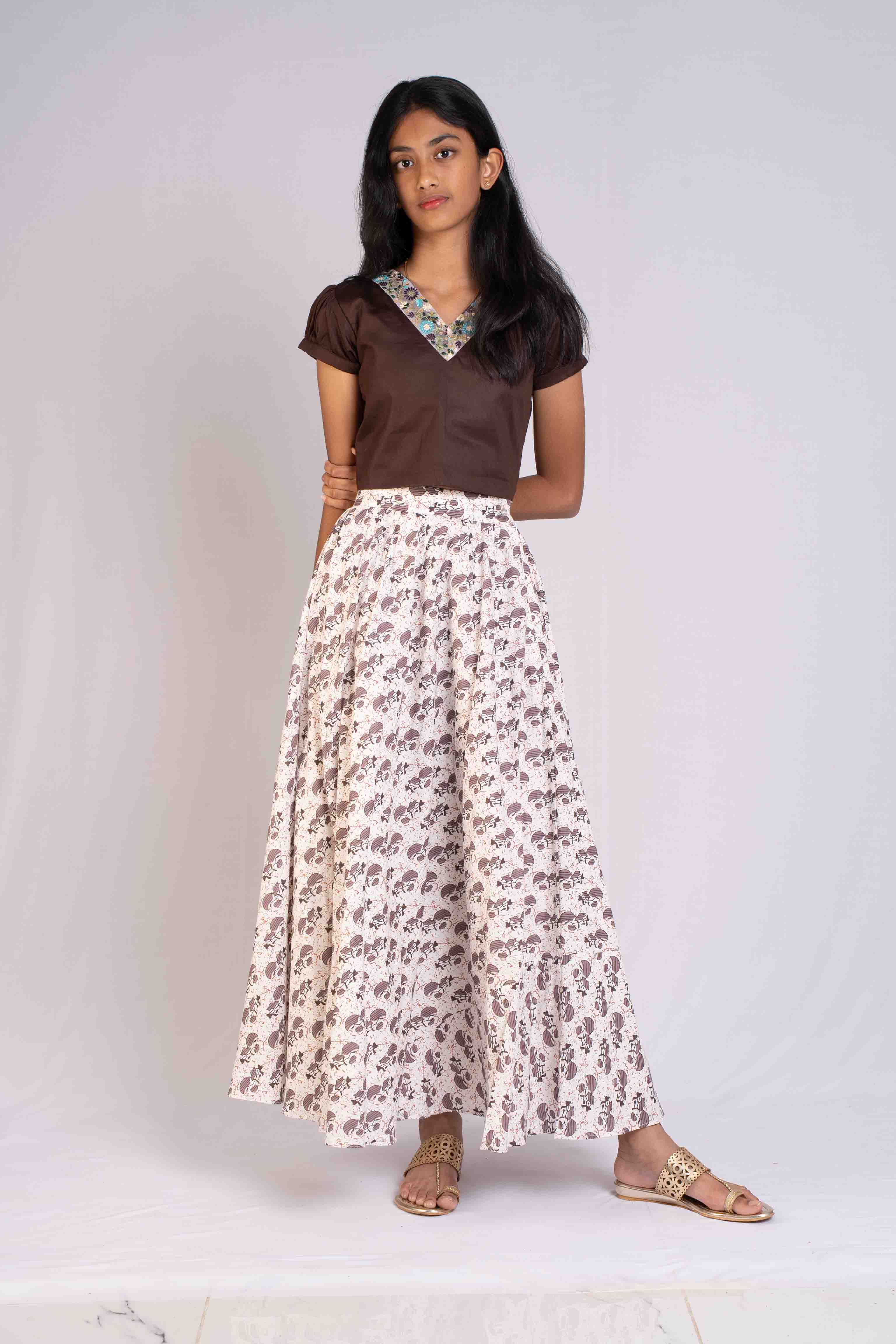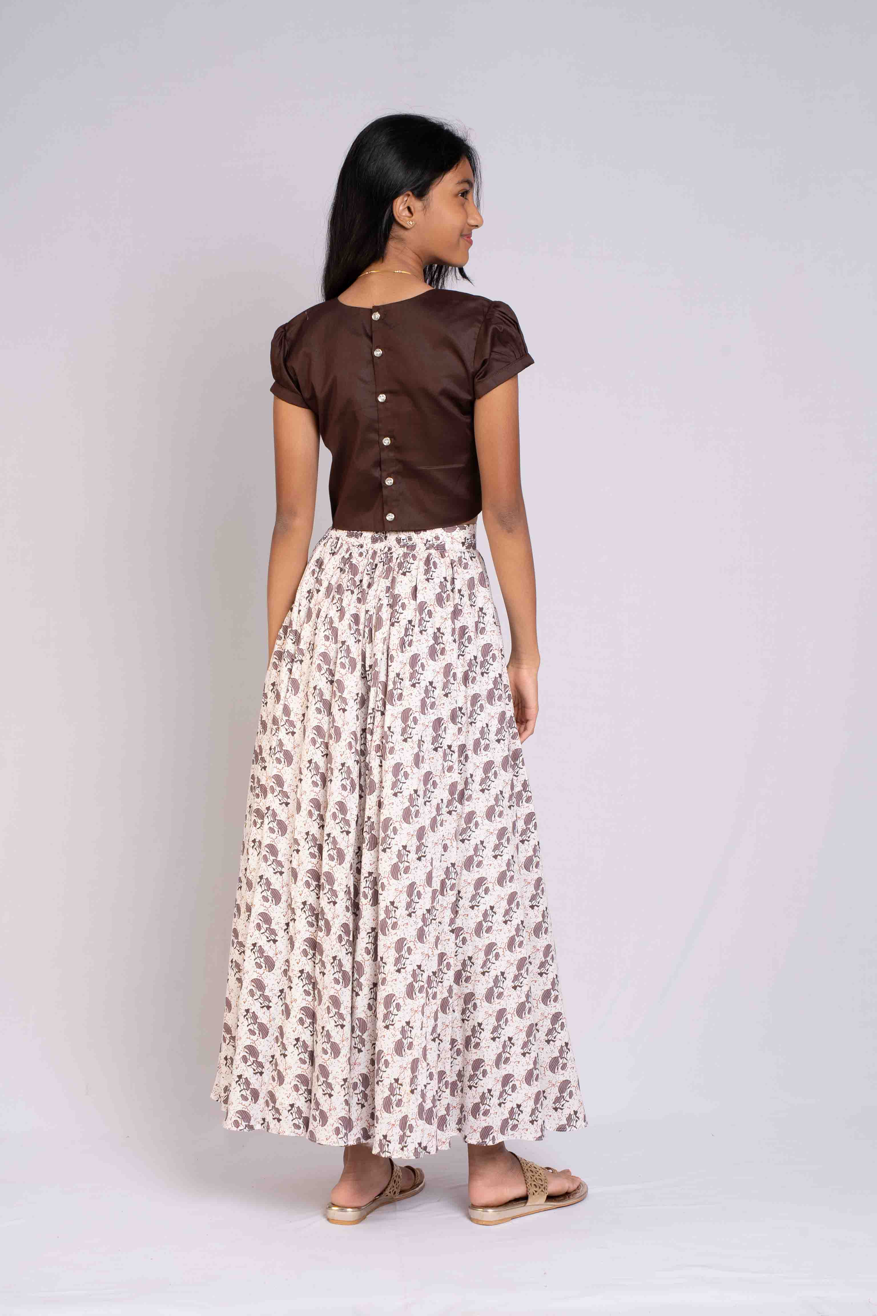 This is a two piece set with lace detailing on the neck and short puff sleeves with flared Lehenga.