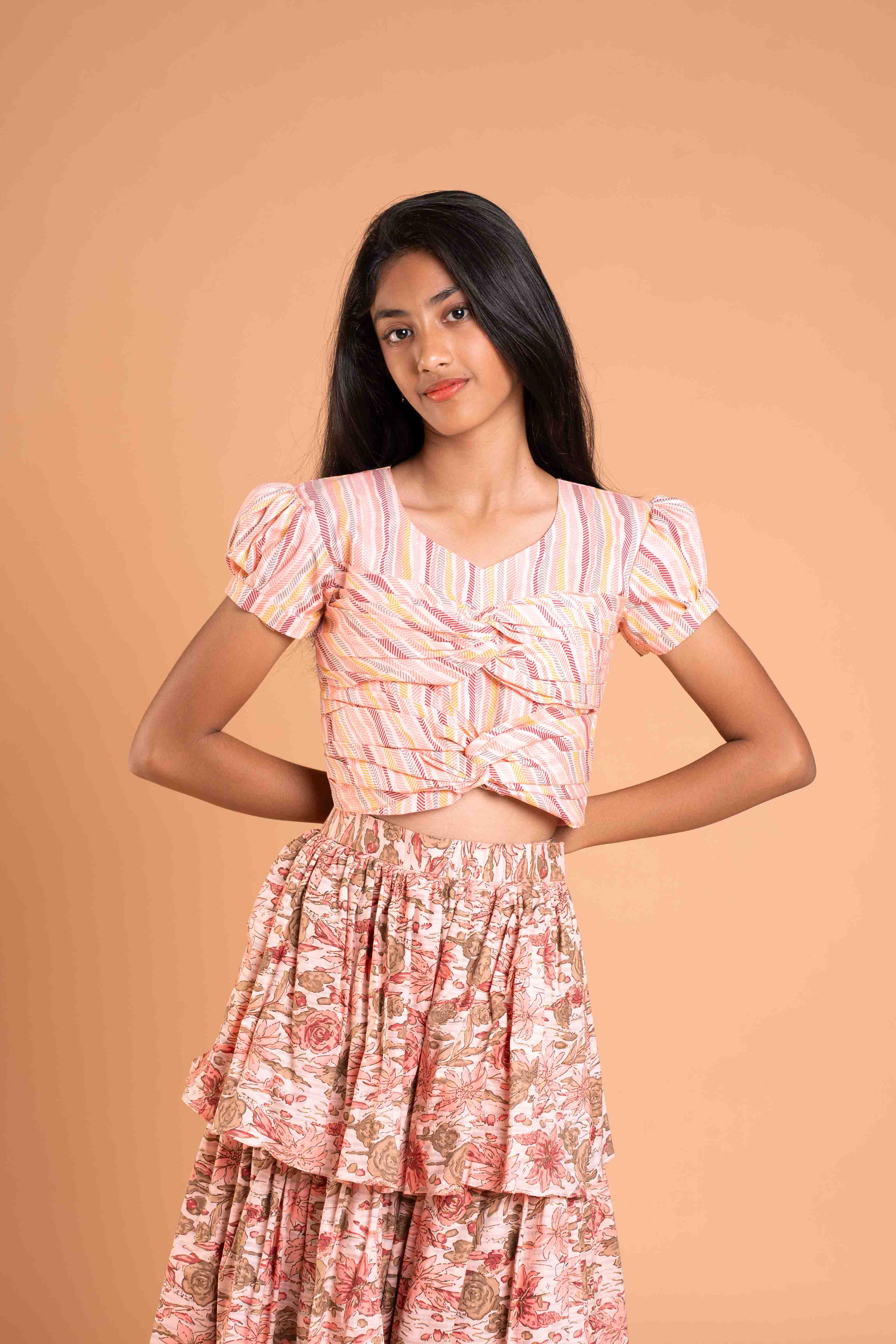 This is a two piece set with cotton layered lehenga and pattern cut crop top.