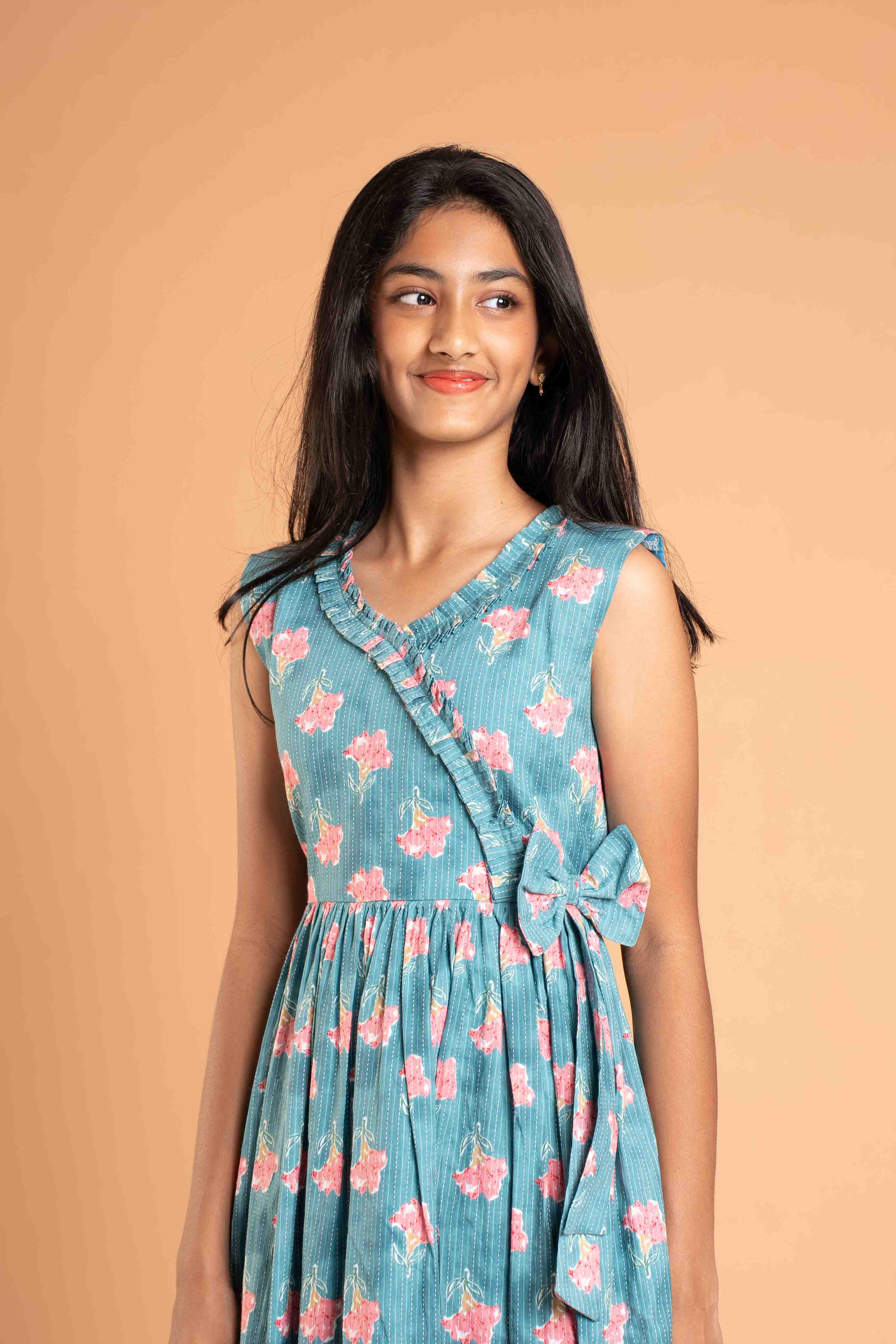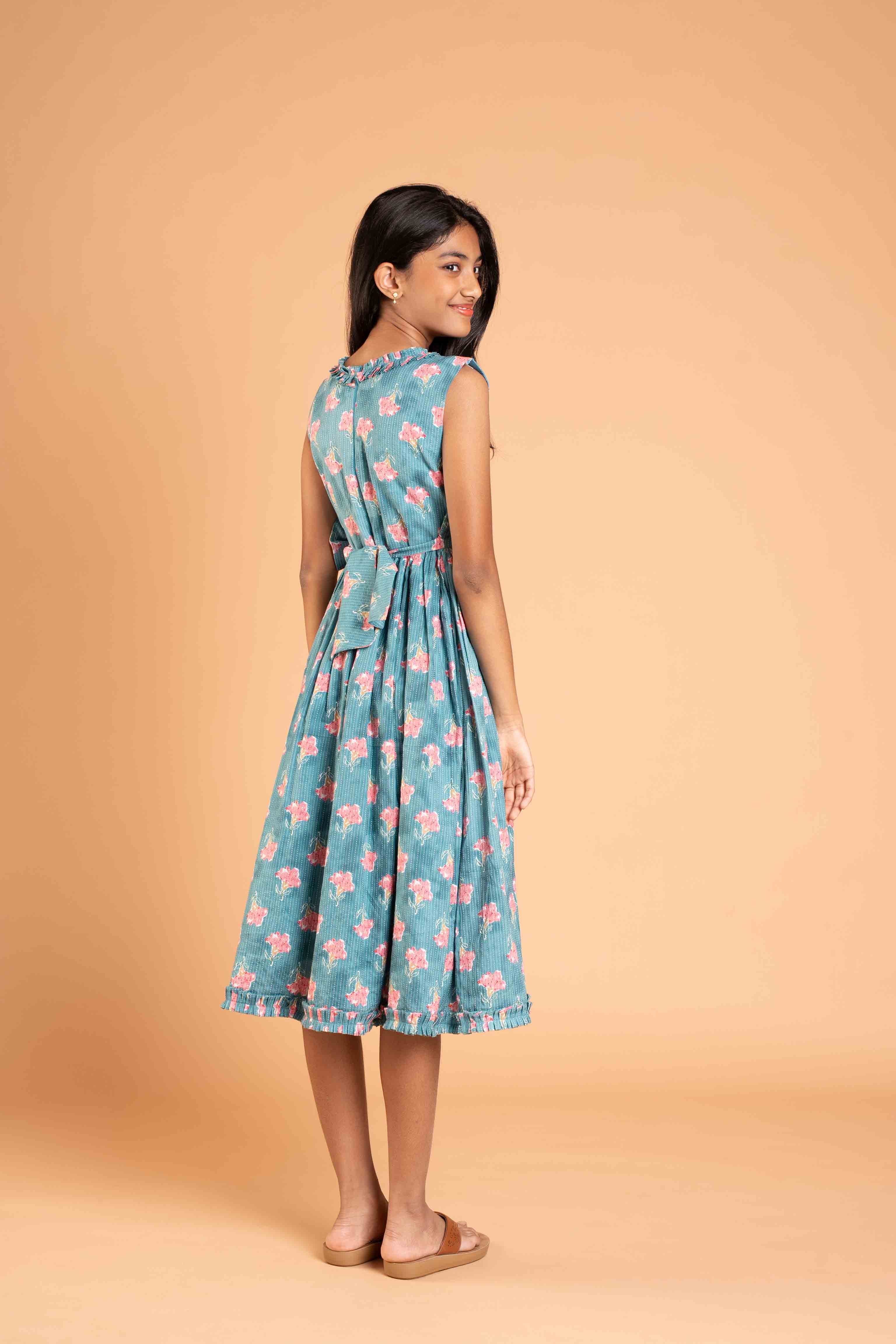 This is a one piece Knee length dress with Frilled neck and bow on the waist.