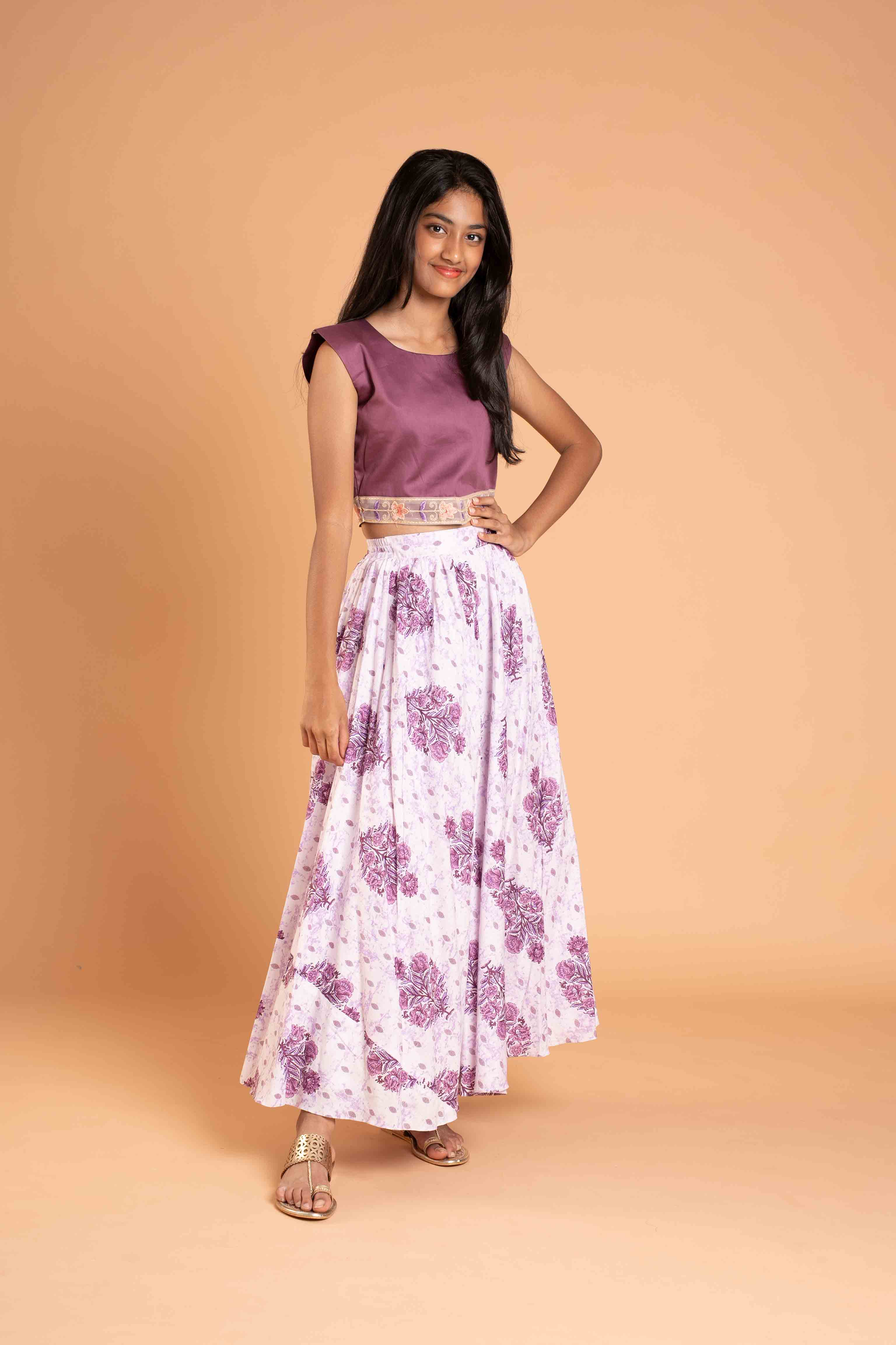 This is a two piece set with pattern cut crop top with lace detailing and flared Lehenga....