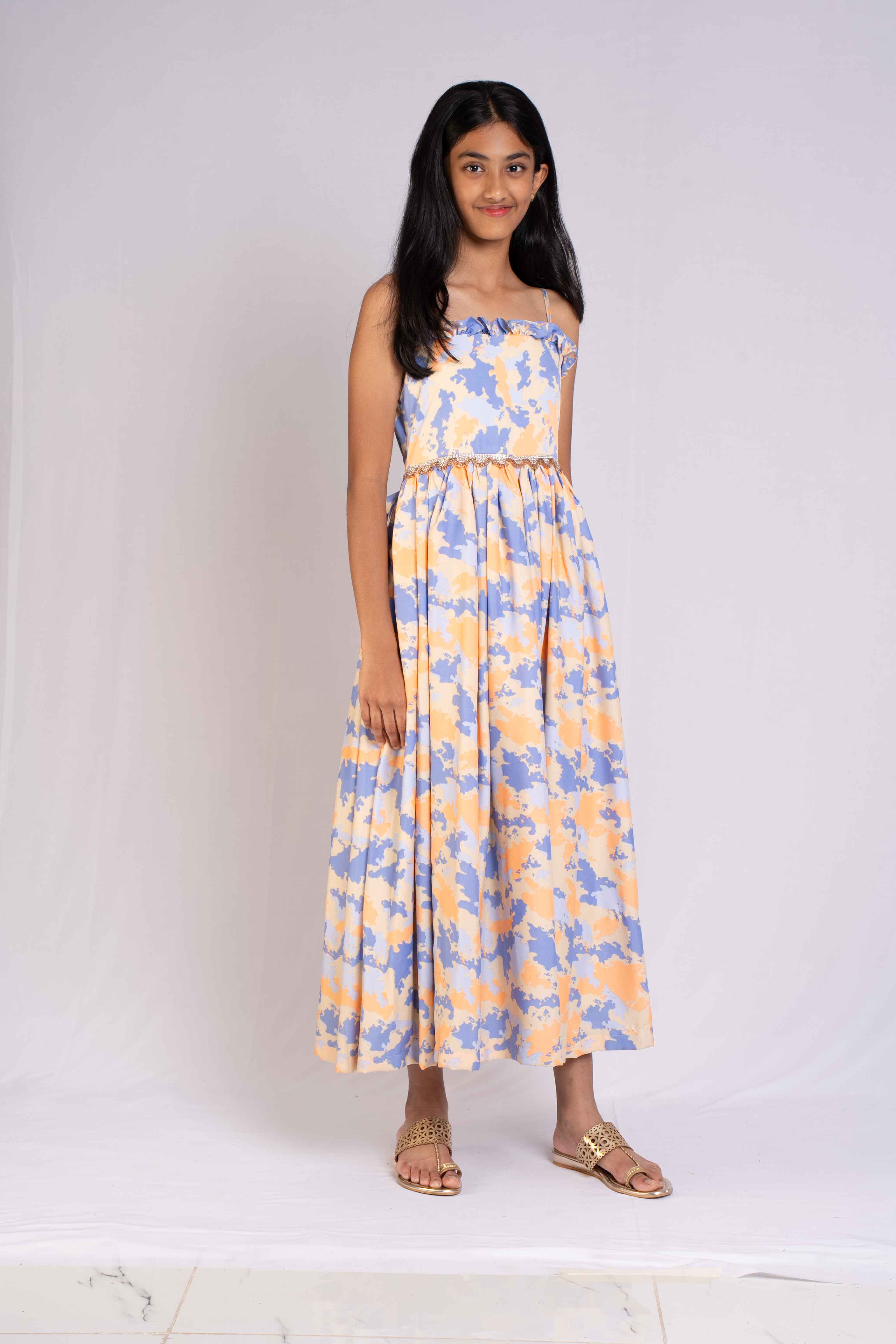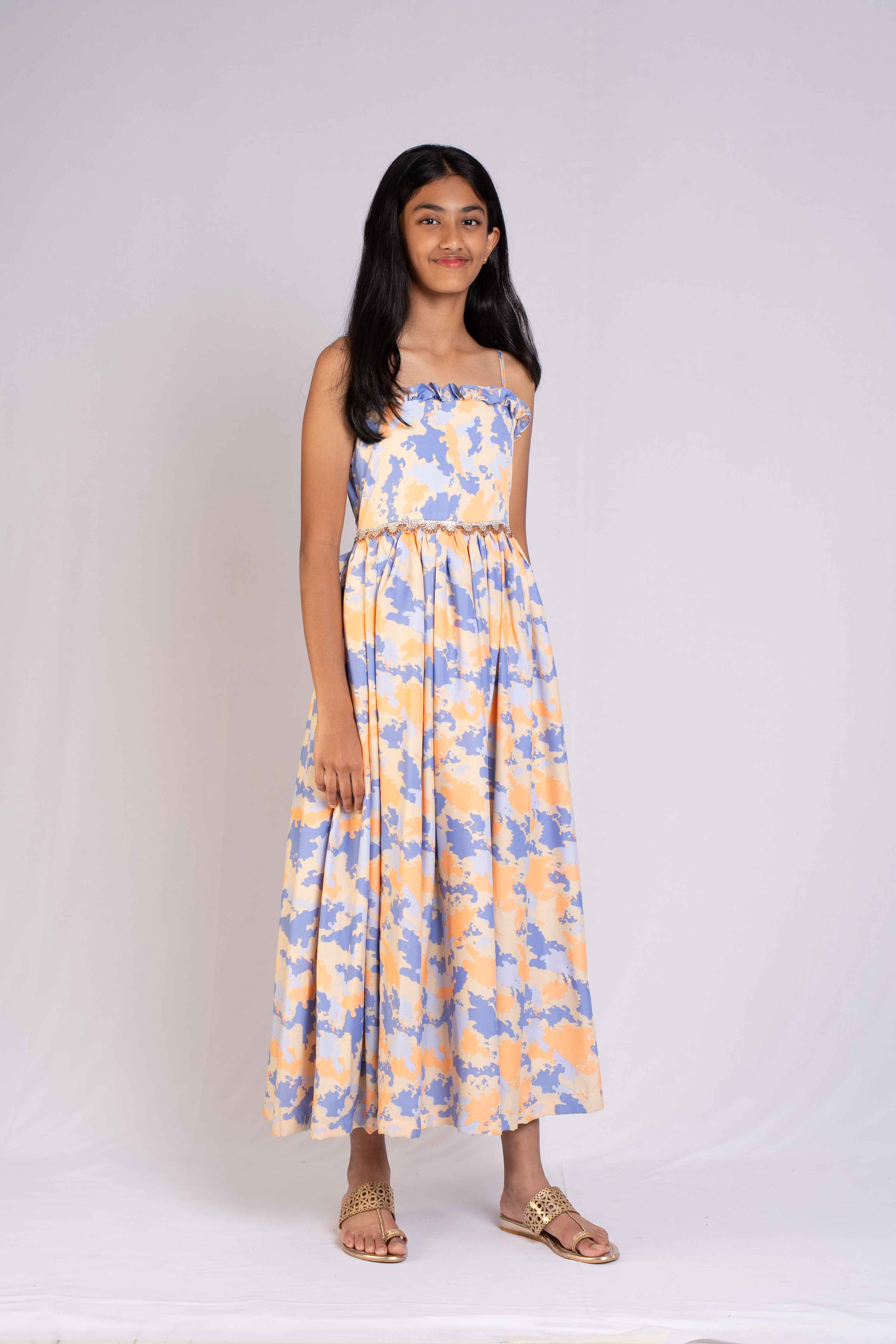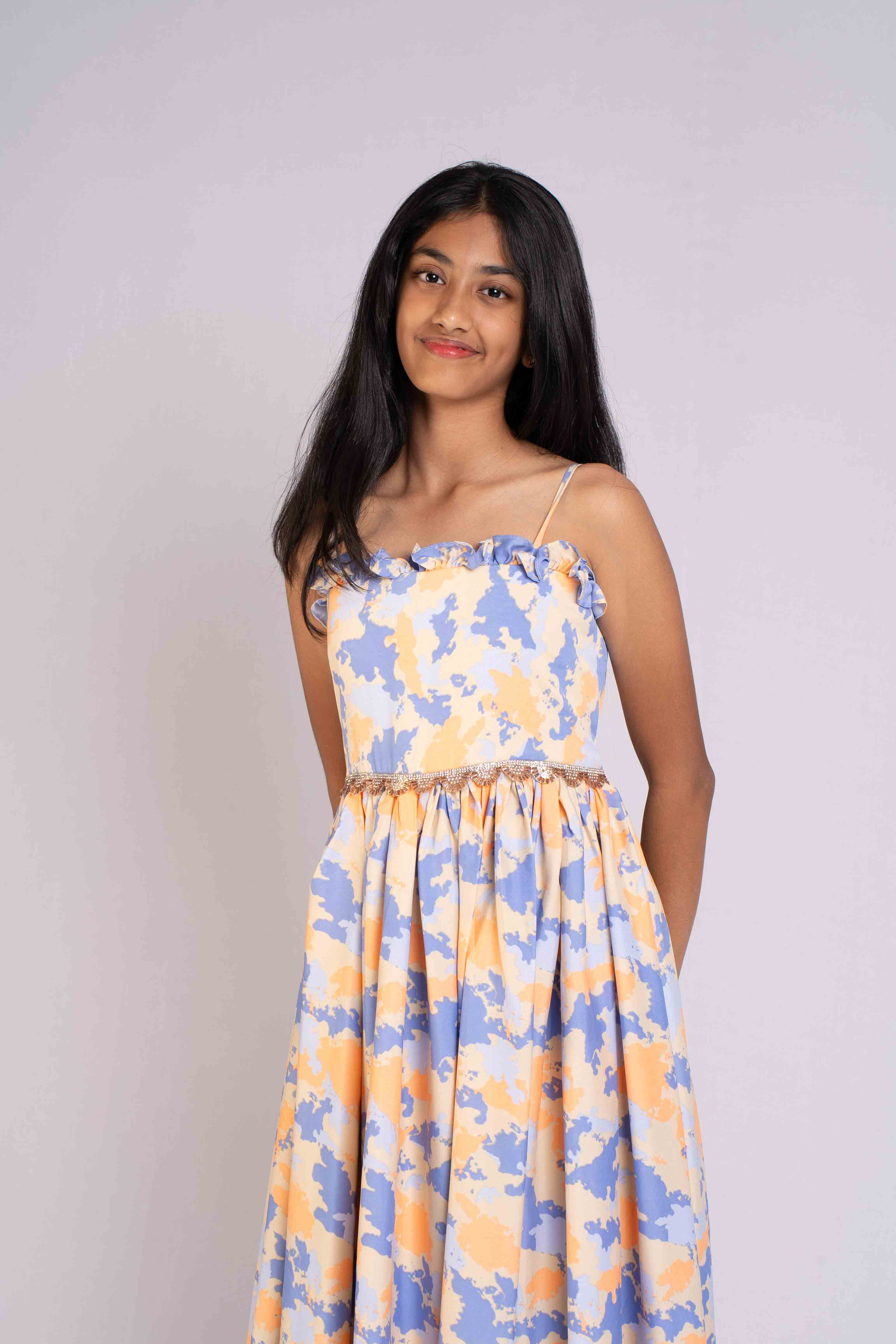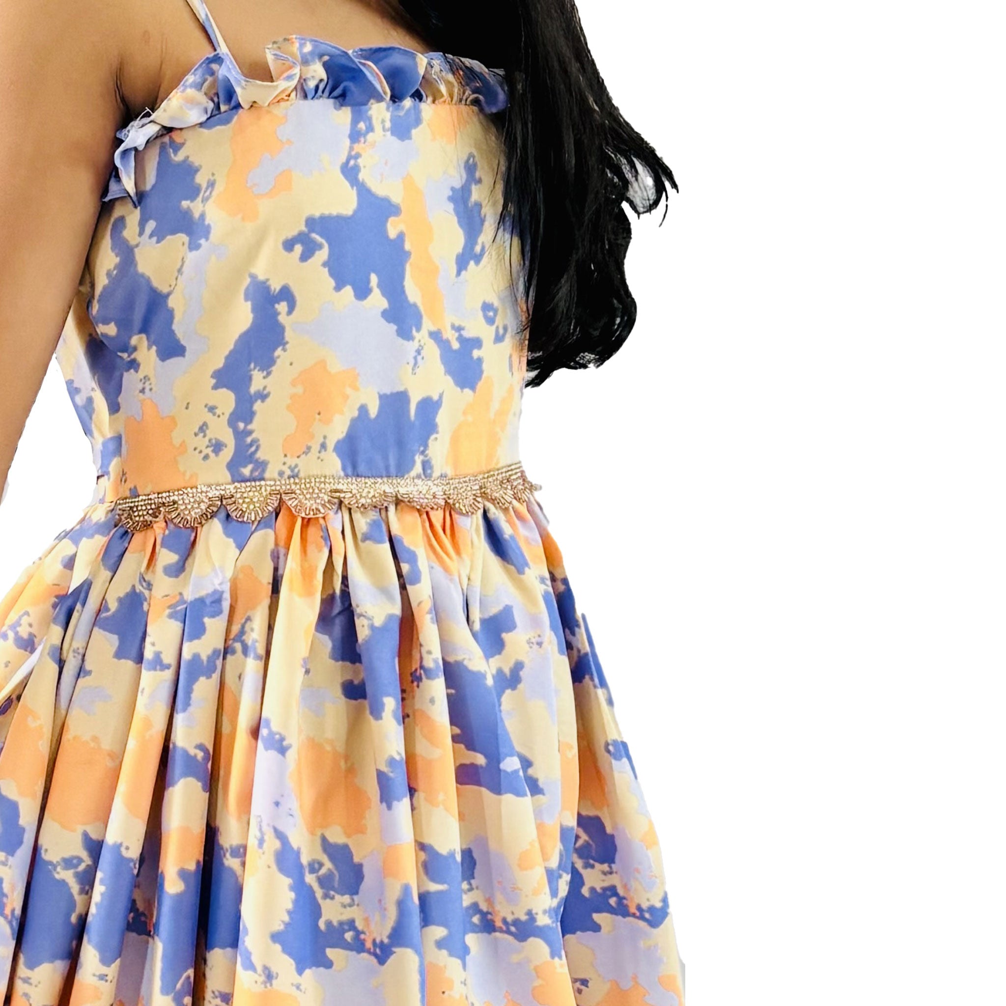 This is a one piece calf length dress with frills around the neck and glittery lace on the waist