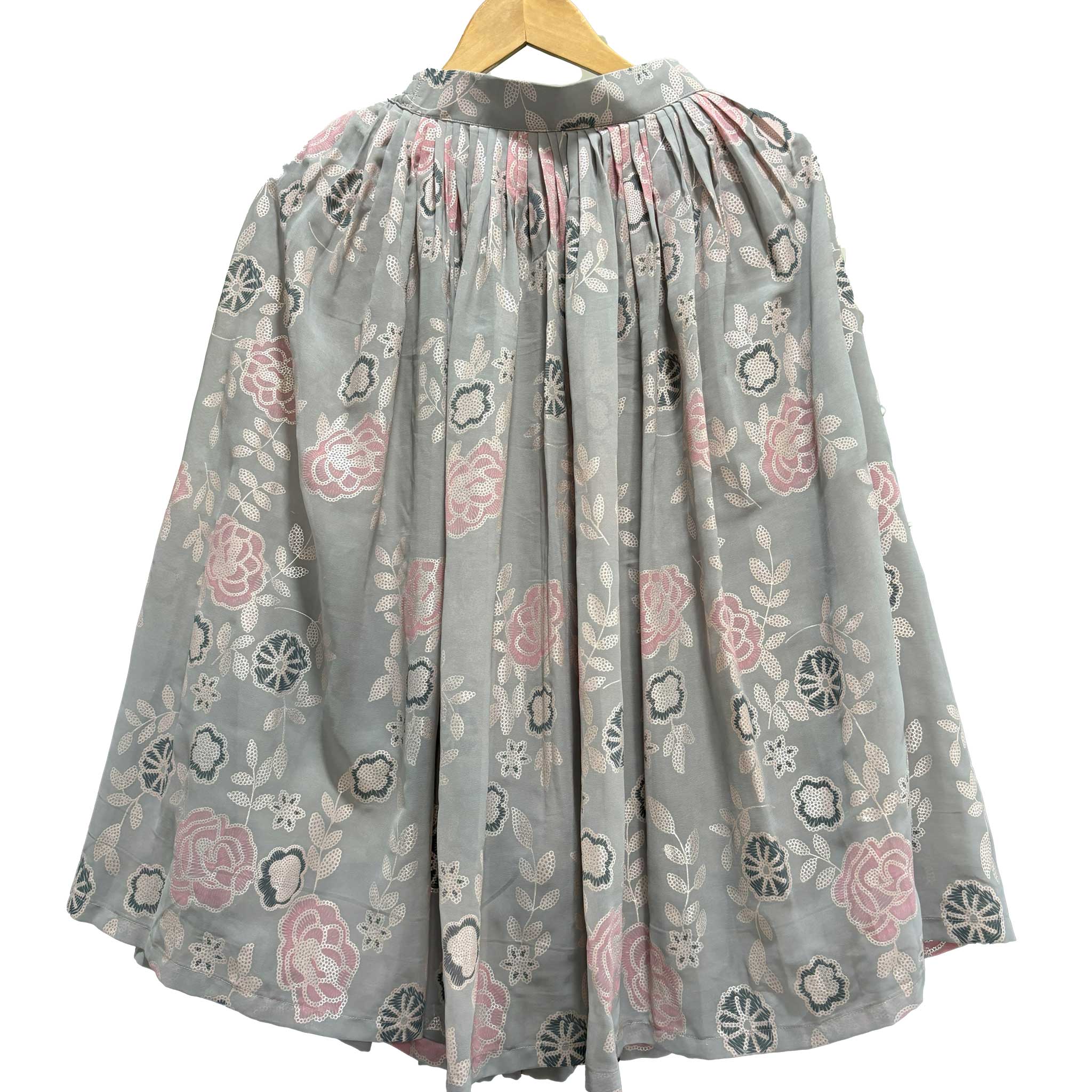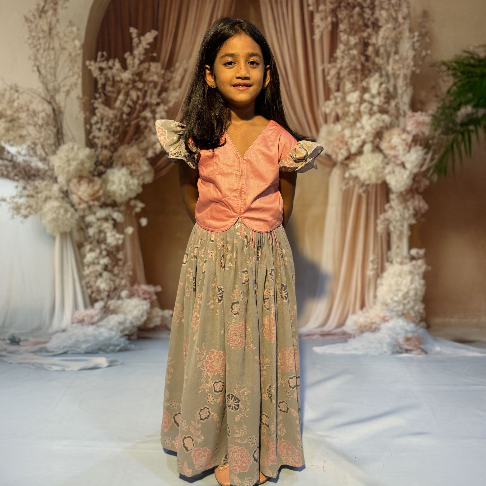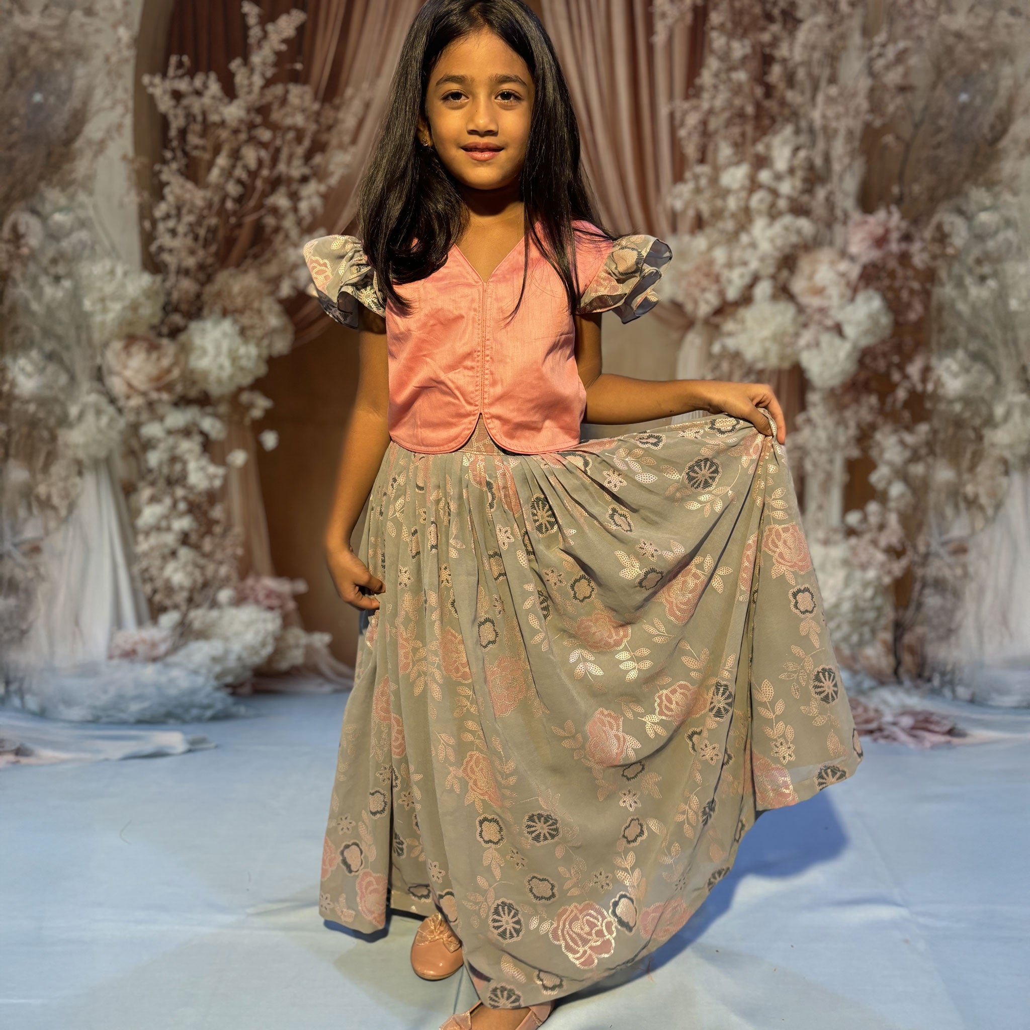 This is a two piece set with straight frills Lehanga and pattern cut crop top with matching sleeves