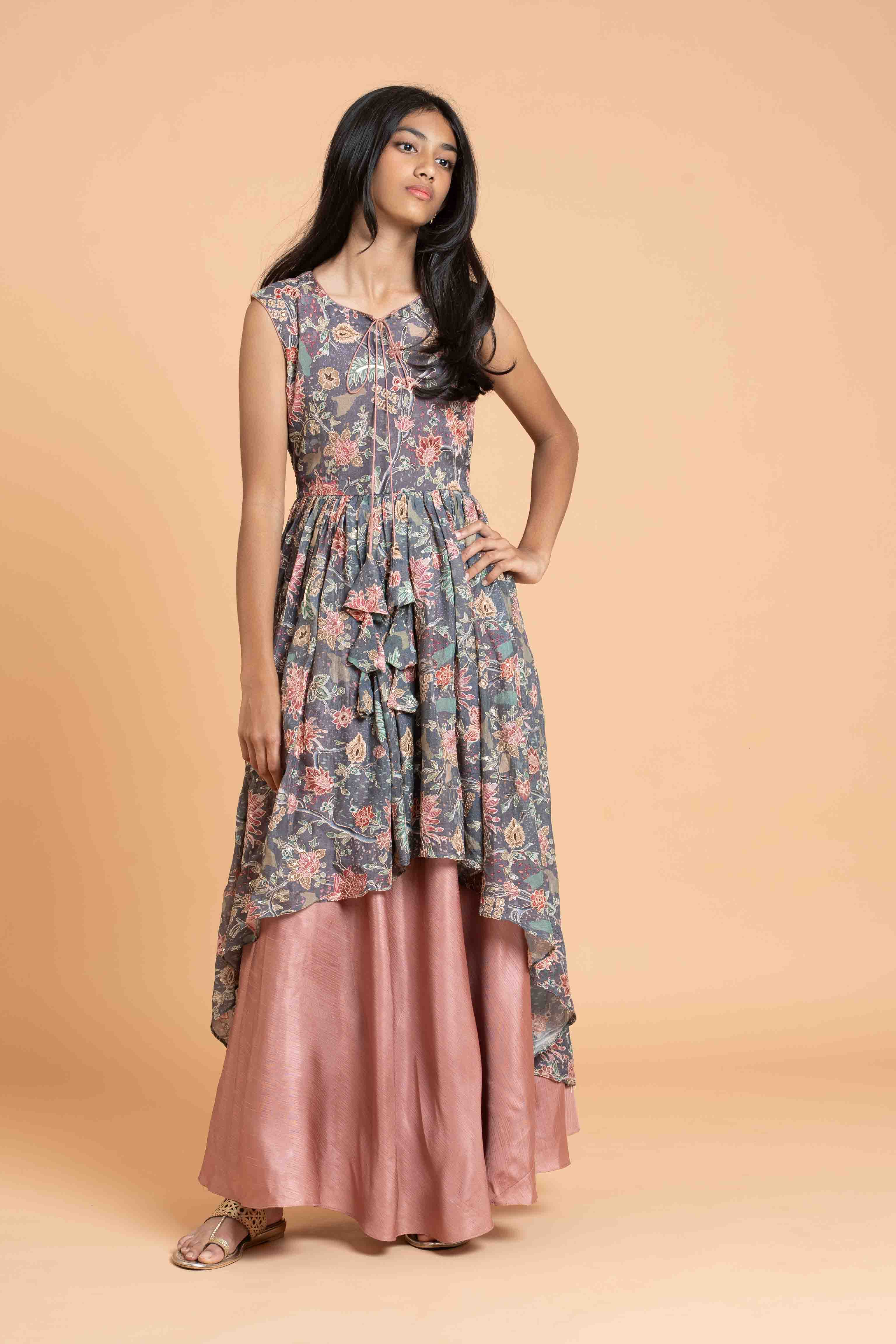 This is a single piece dress with embroidery pure crepe C- cut layering over silk Full flare layer.