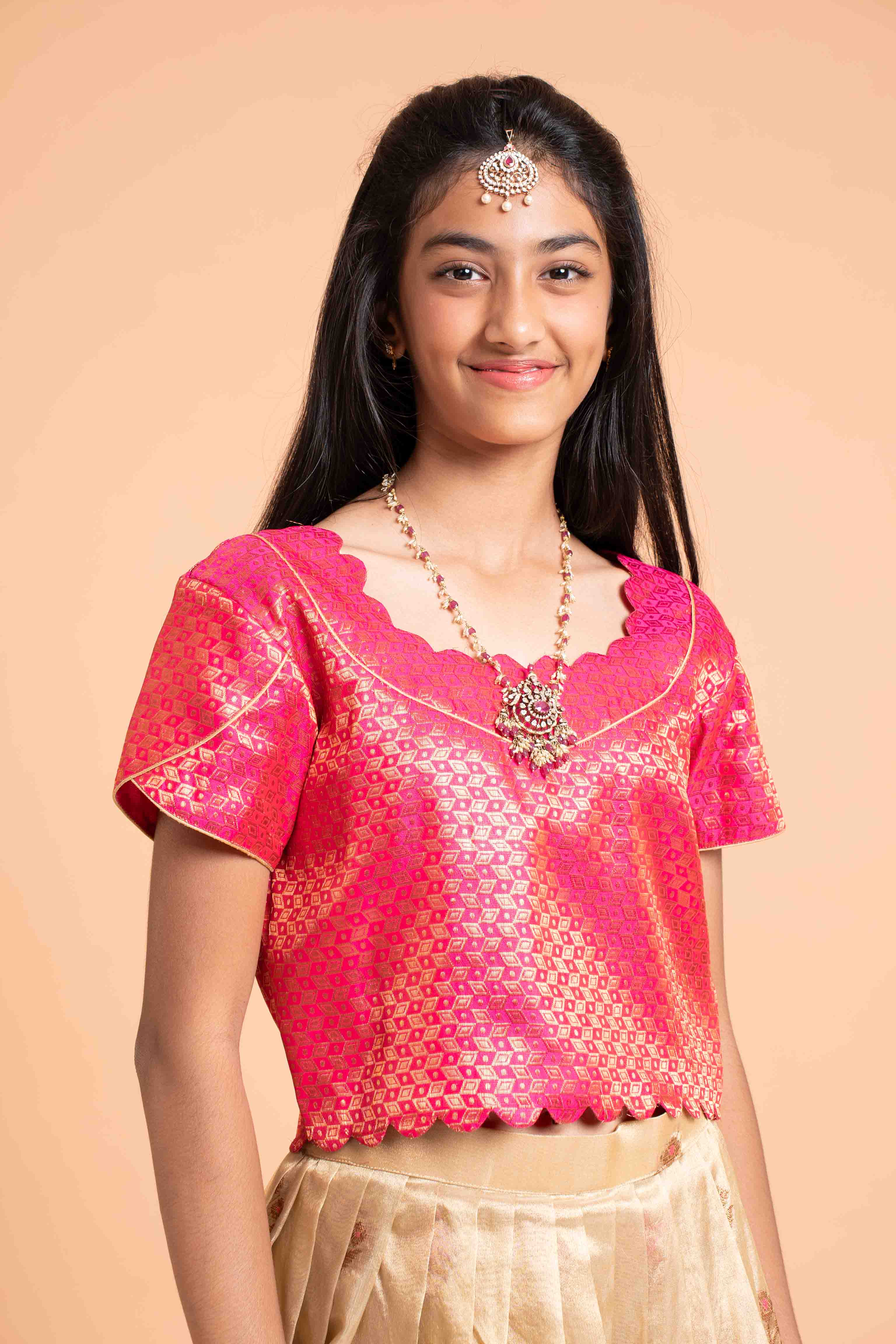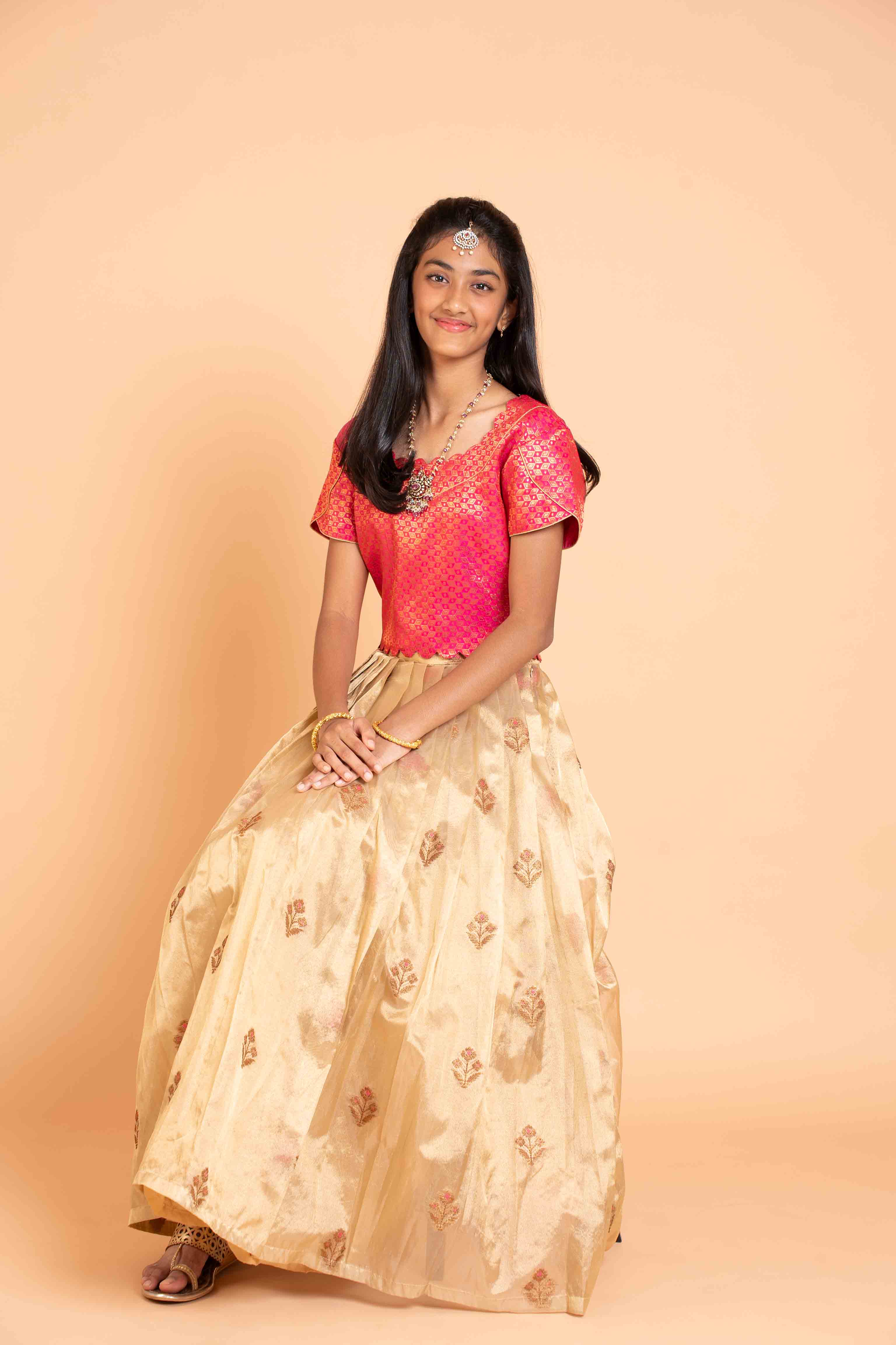 This is a two piece set with premium gold tissue Lehenga and brocade crop top with scallop detailing.