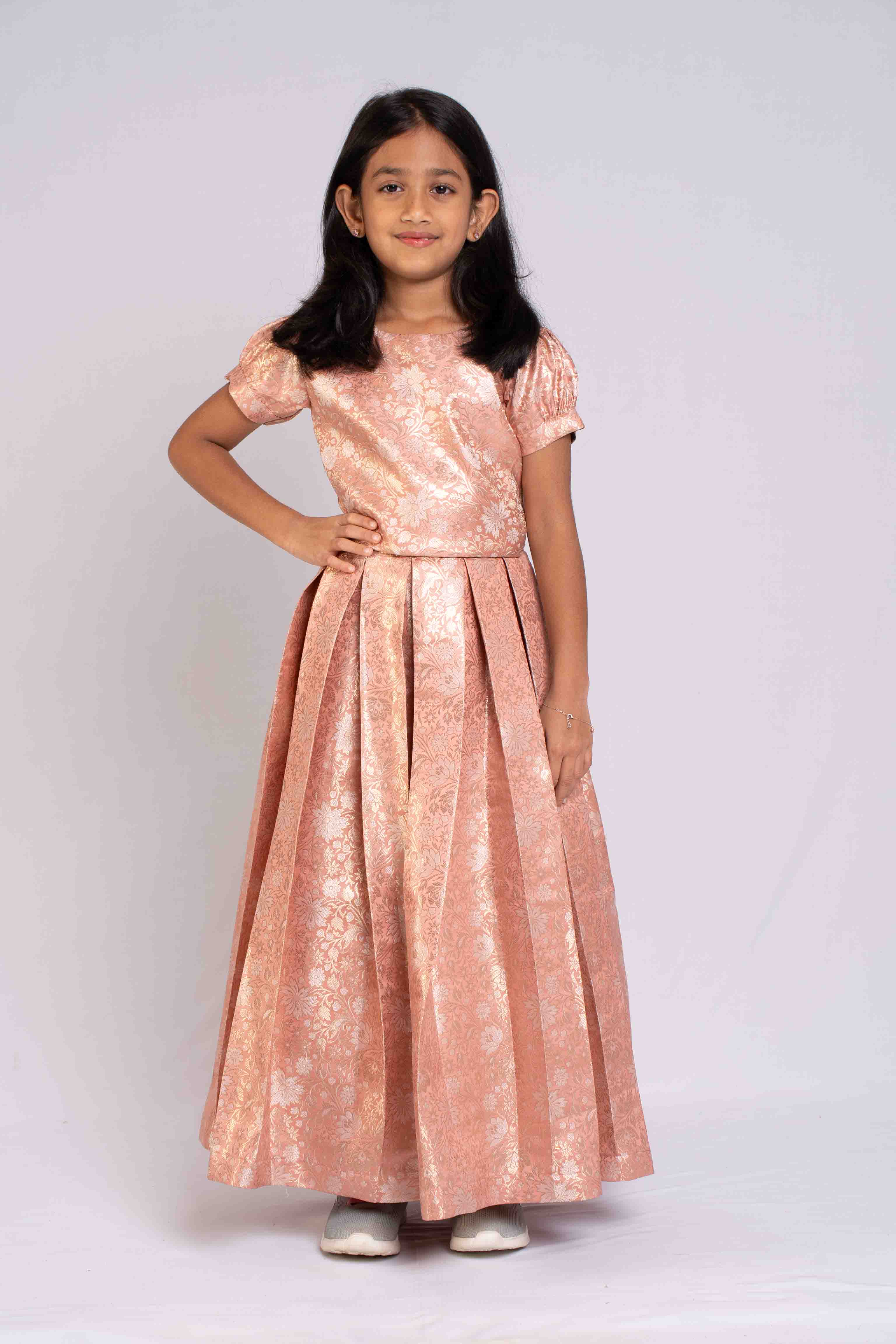 This is a two piece set with box pleted lehenga and puff sleeves crop top.