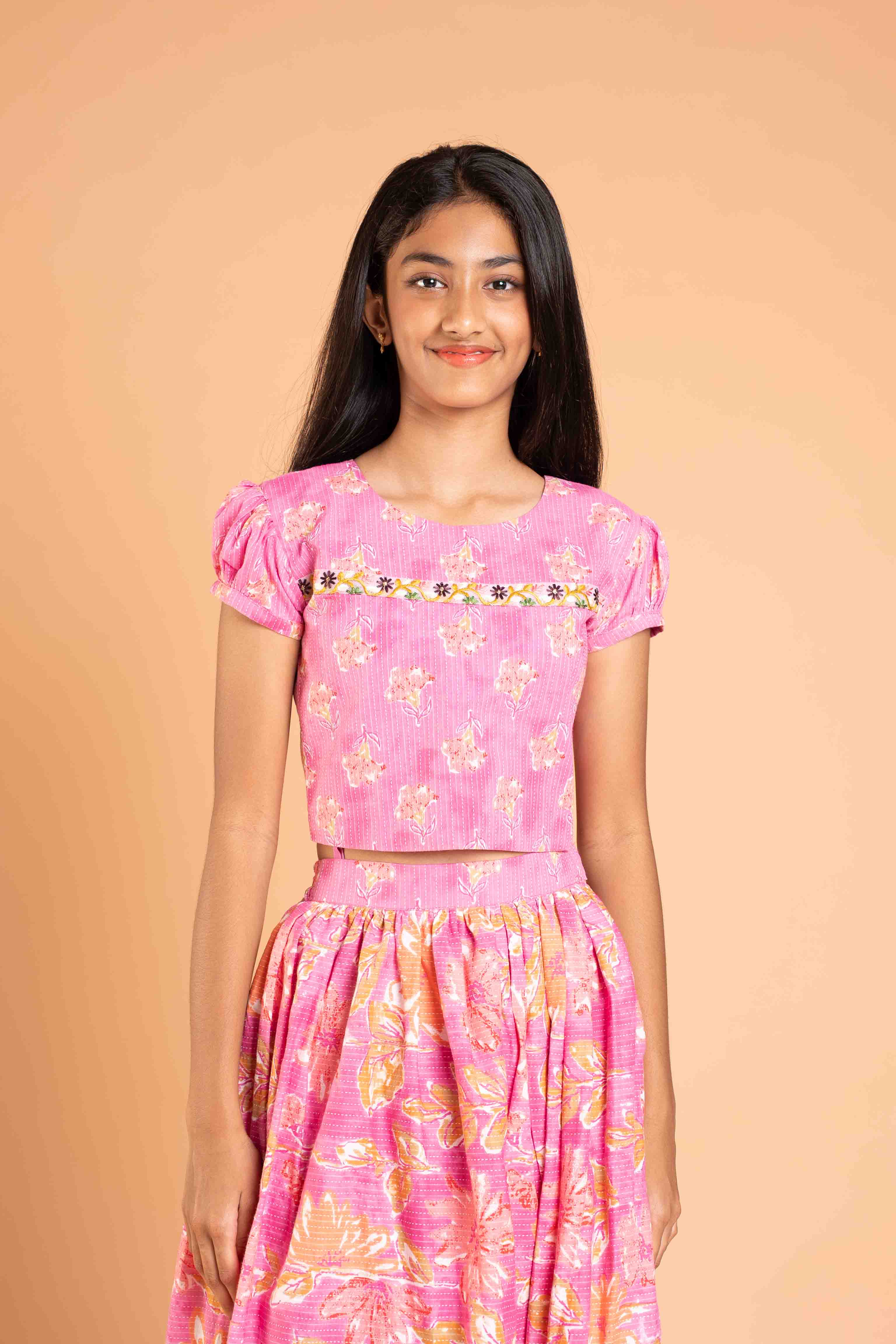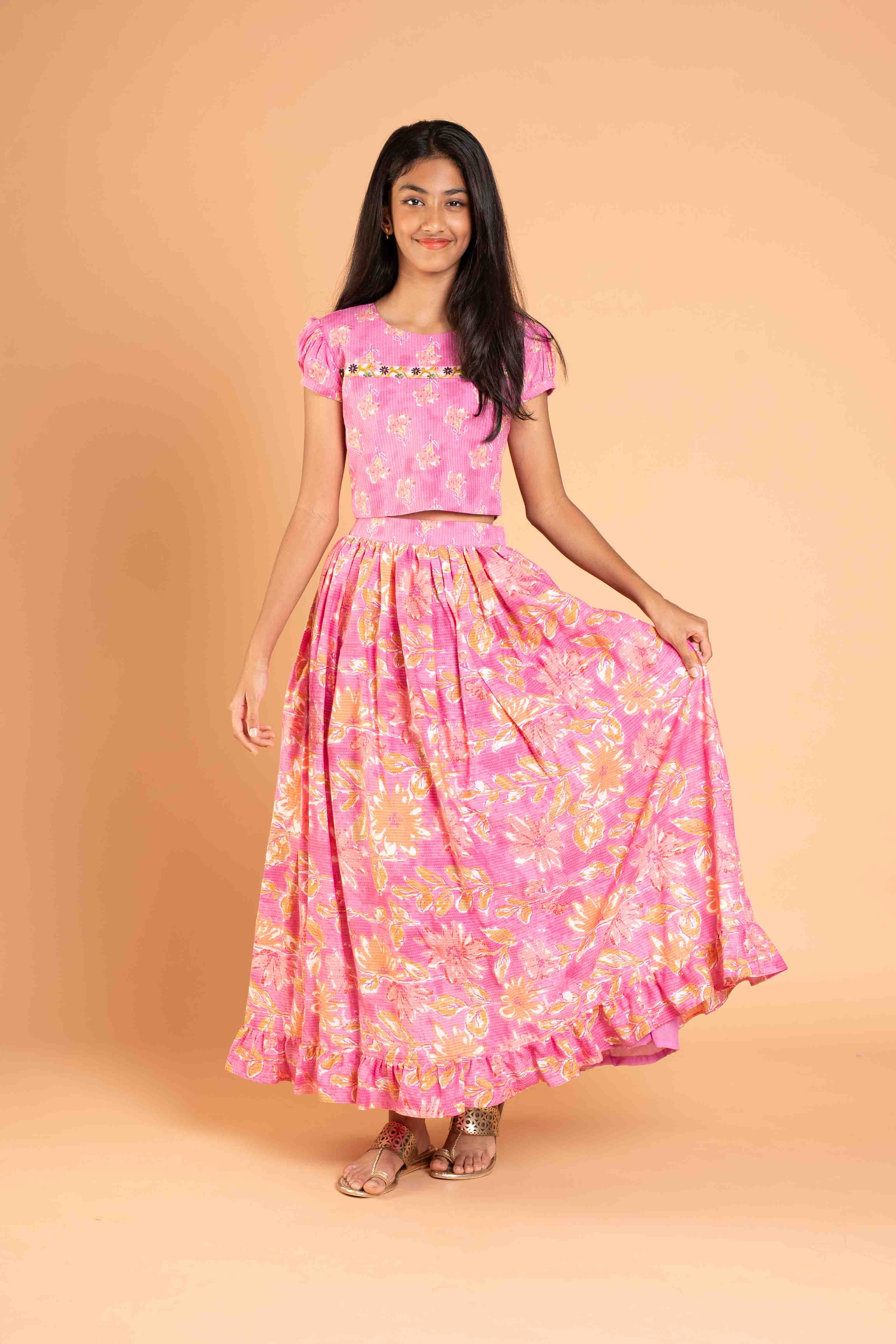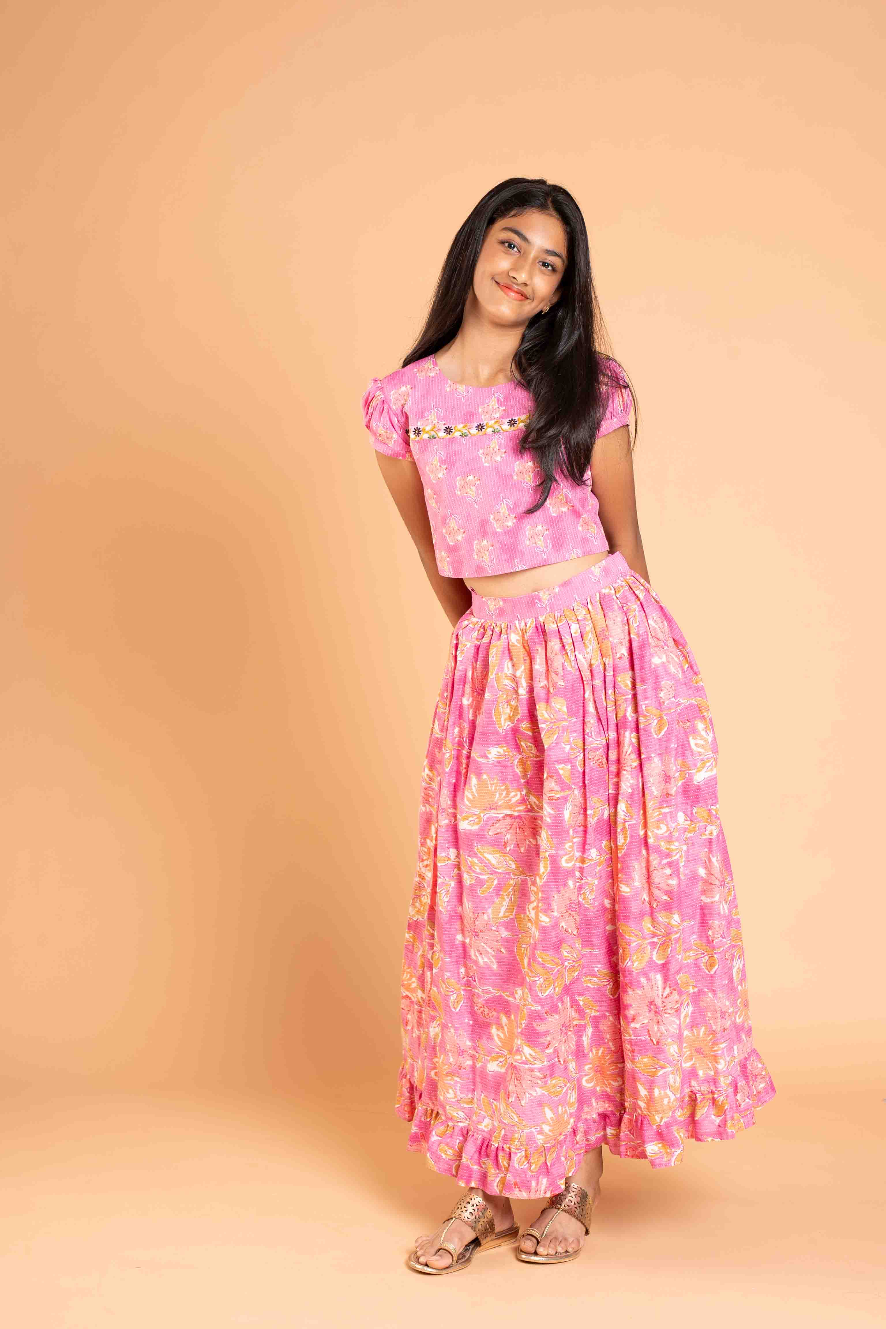 This is a two piece set with straight cut Flared and frills Lehenga and pattern cut crop top with lace Detailing on the front.