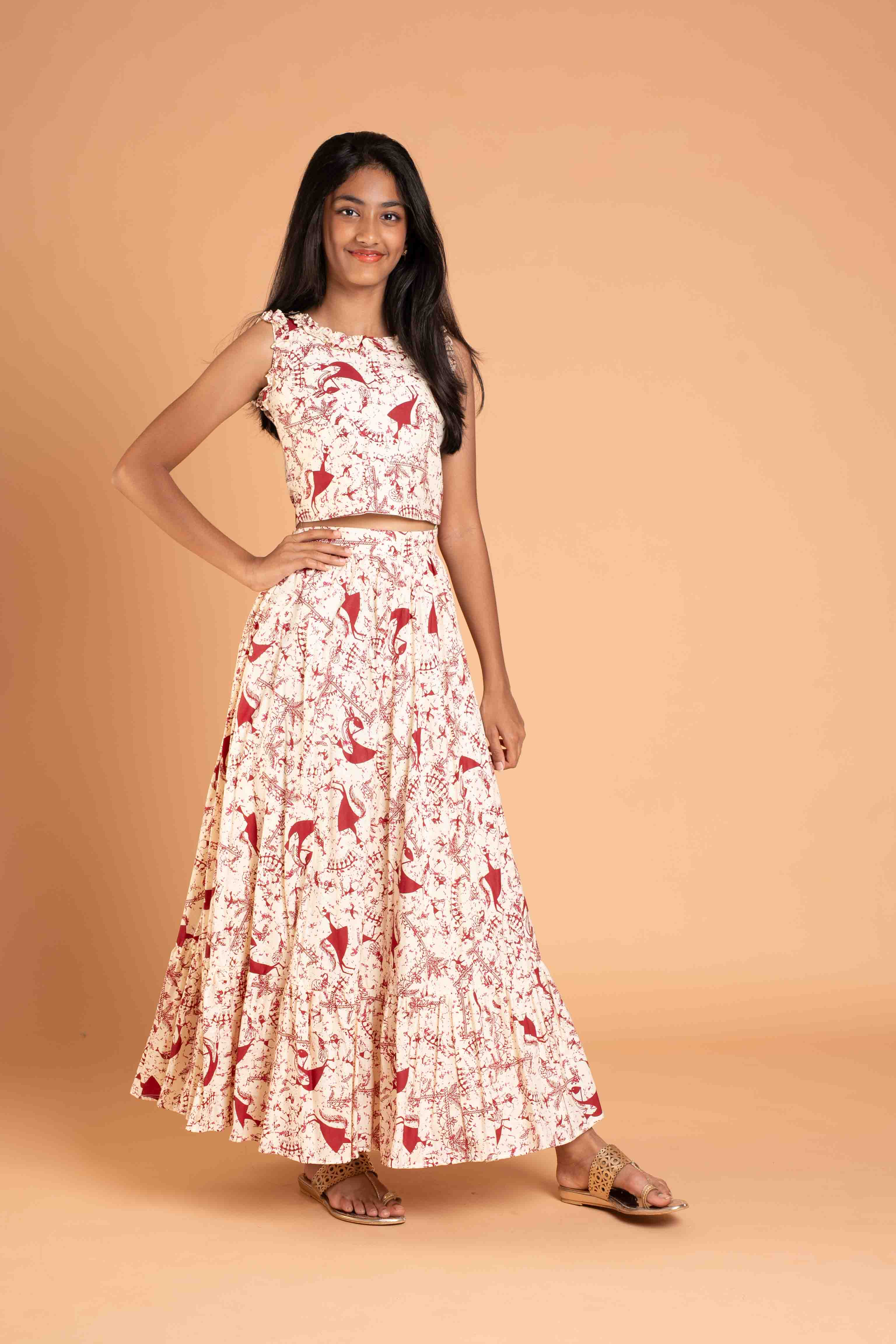 Trendy Frills Collar Maroon Print Cotton Lehenga And Crop Top